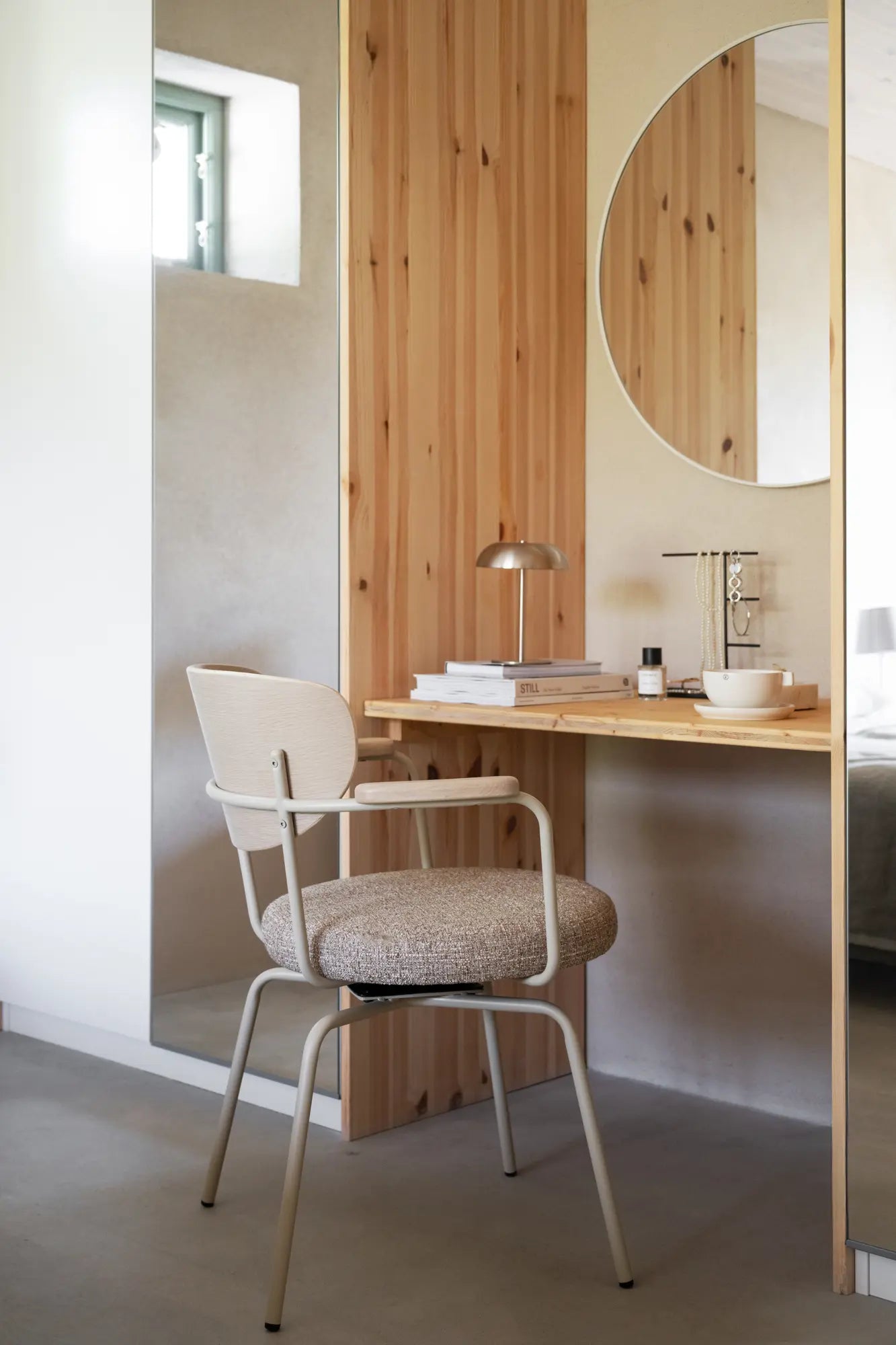 Stolen er utstyrt med en praktisk returfunksjon som gjør at den automatisk dreier tilbake til utgangsposisjonen – ideelt til spisestuen, møterom eller sosiale soner der symmetri og ryddighet er viktig. Merrick kan også stables, opptil tre stoler, noe som gjør den svært plassbesparende og fleksibel i bruk.