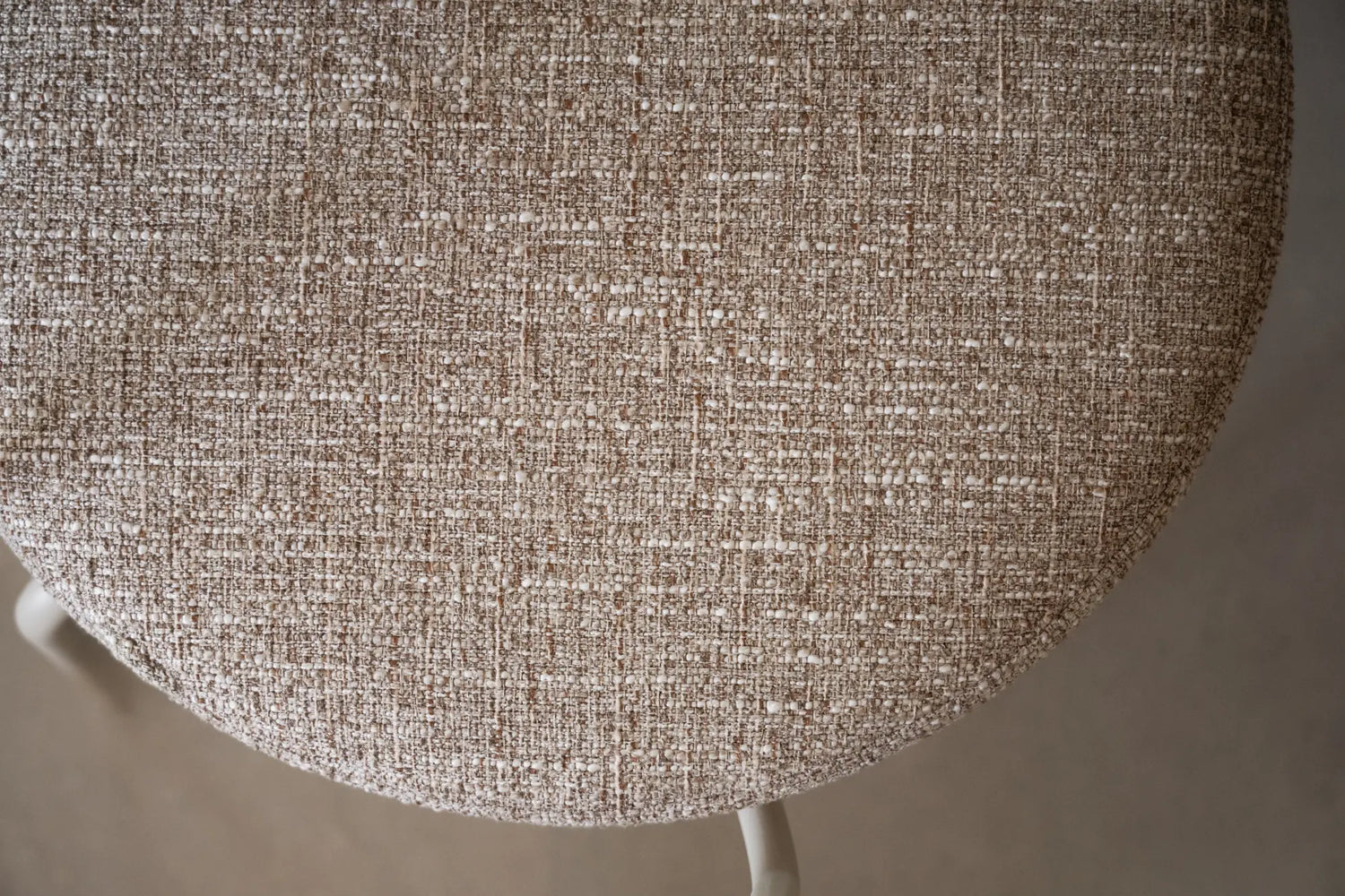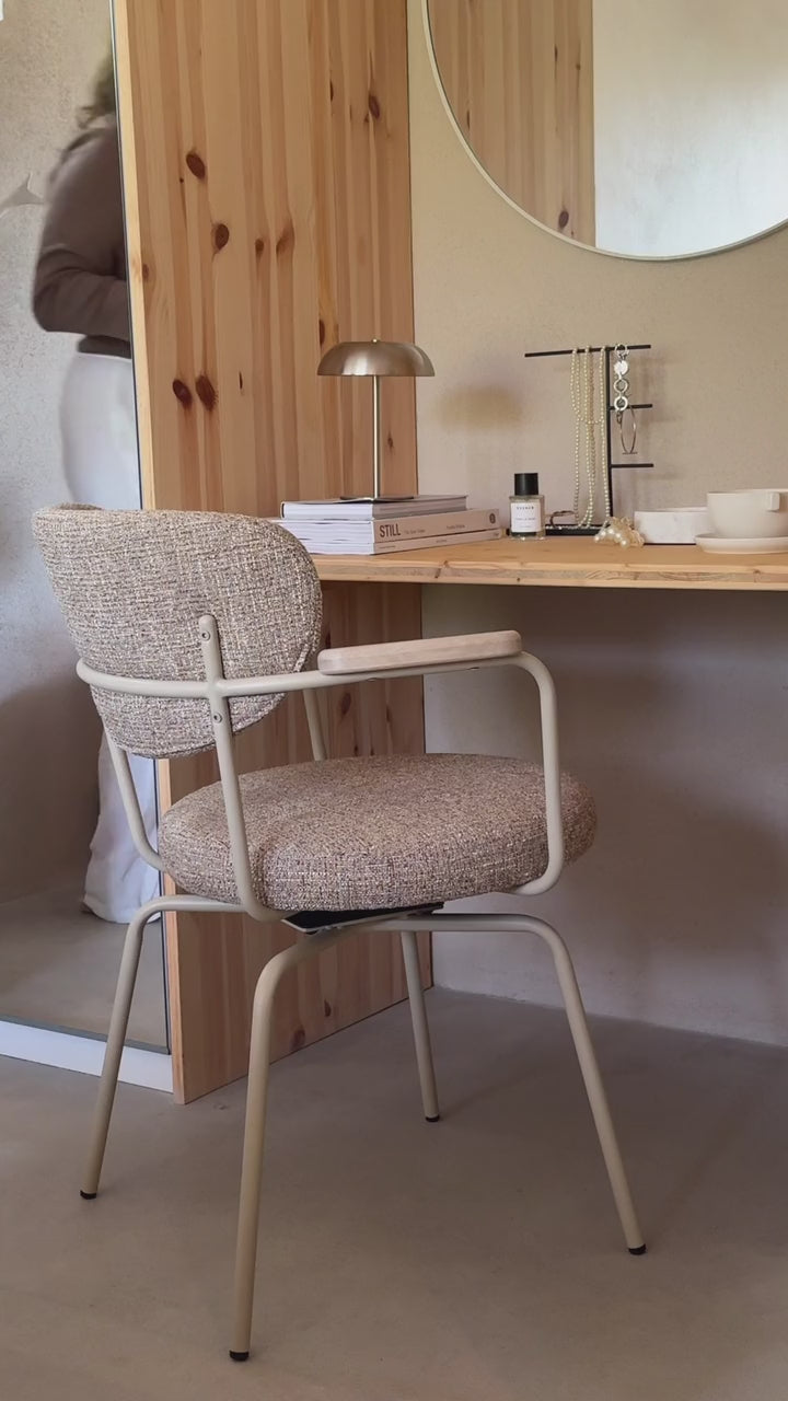 Merrick spisestol er en moderne stol med slank og elegant konstruksjon som kombinerer industrielt preg med varme og innbydende materialer. Den har en beige metallramme kombinert med et slitesterkt polstret sete og rygg, noe som gir en perfekt balanse mellom rene linjer og god sittekomfort.