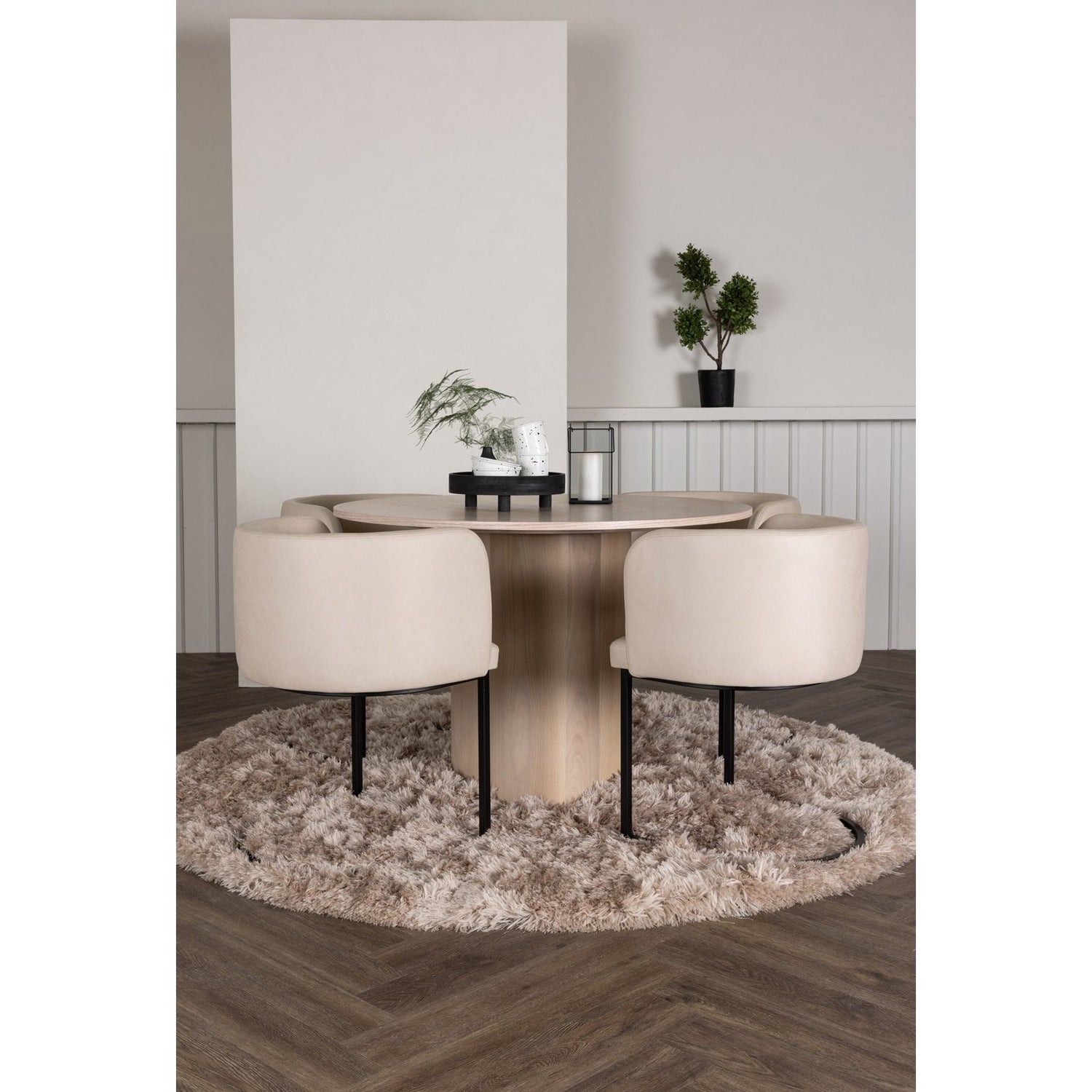 Olivia spisebord og Simrishman spisestoler danner sammen en spisegruppe som kombinerer komfort, design og motebevisst stil. Bordets diameter er 110 cm, perfekt for både hverdag og sosiale anledninger.