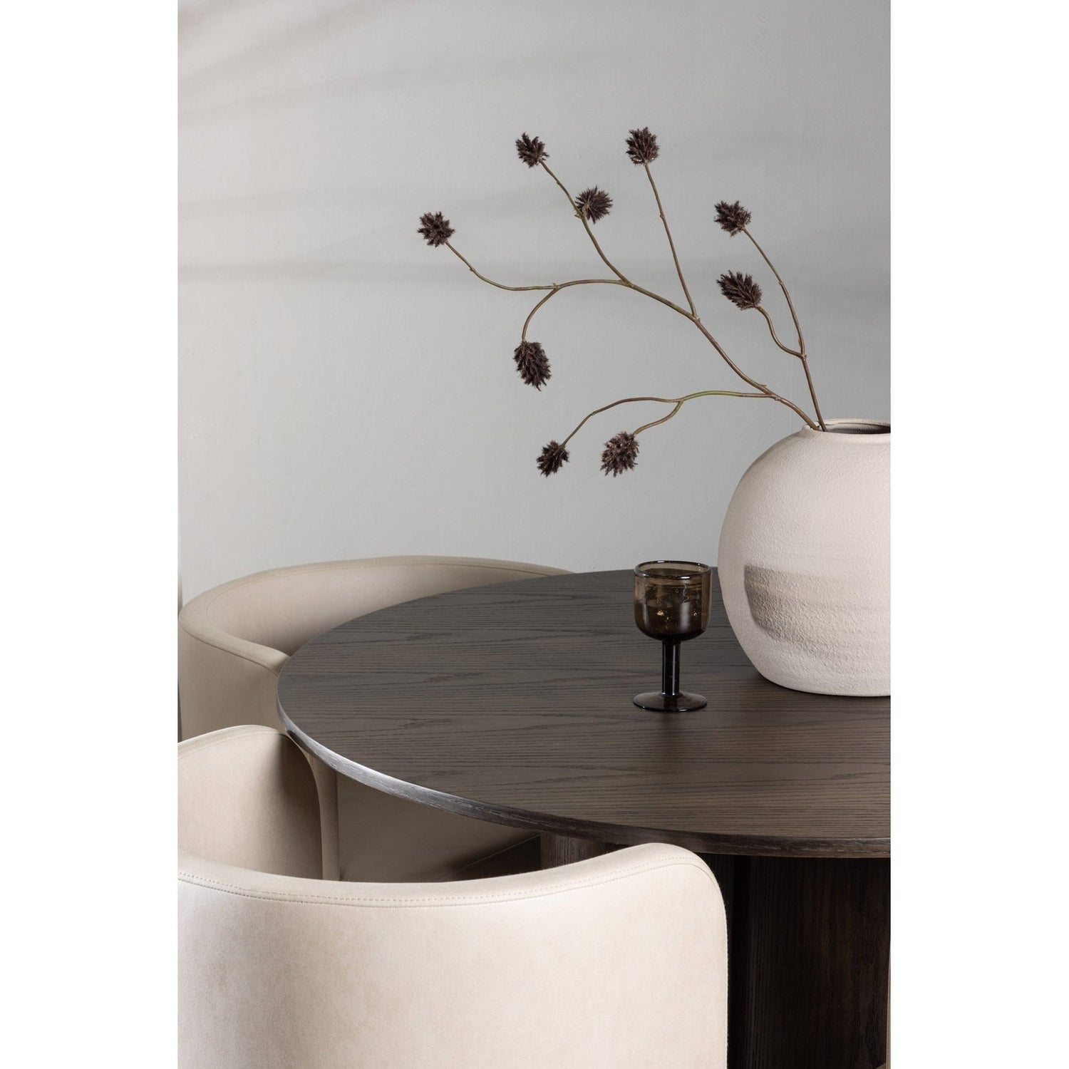 En elegant spisegruppe med myke former og moderne skandinavisk uttrykk. Olivia spisebord har en stilren design i en varm mocca-farge som gir spiseplassen et eksklusivt og innbydende preg. Bordet har en tynn bordplate i MDF og tre sylinderformede ben samlet under midten, noe som skaper et luftig og balansert uttrykk. Den lett dekkende overflaten lar materialets struktur komme subtilt til syne.