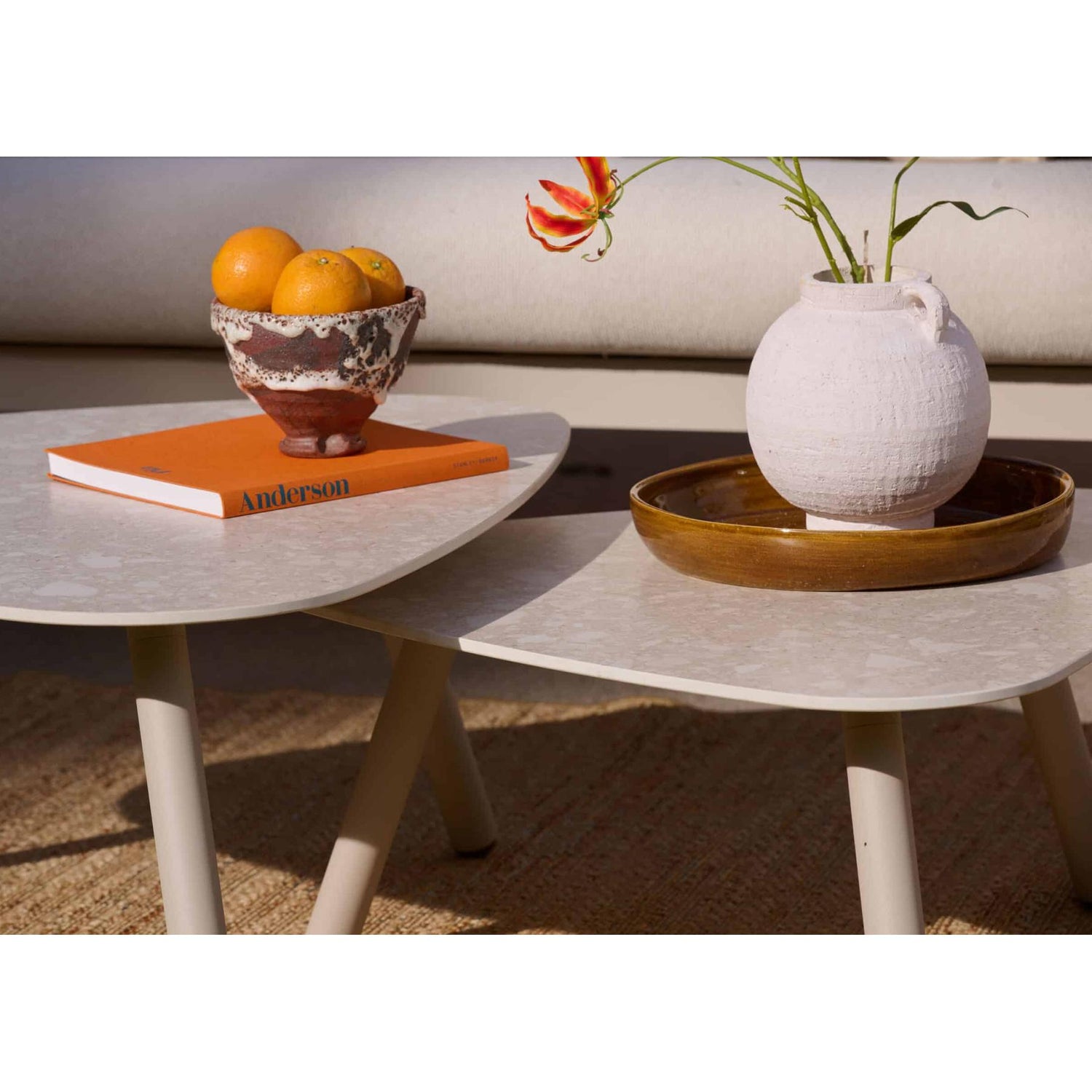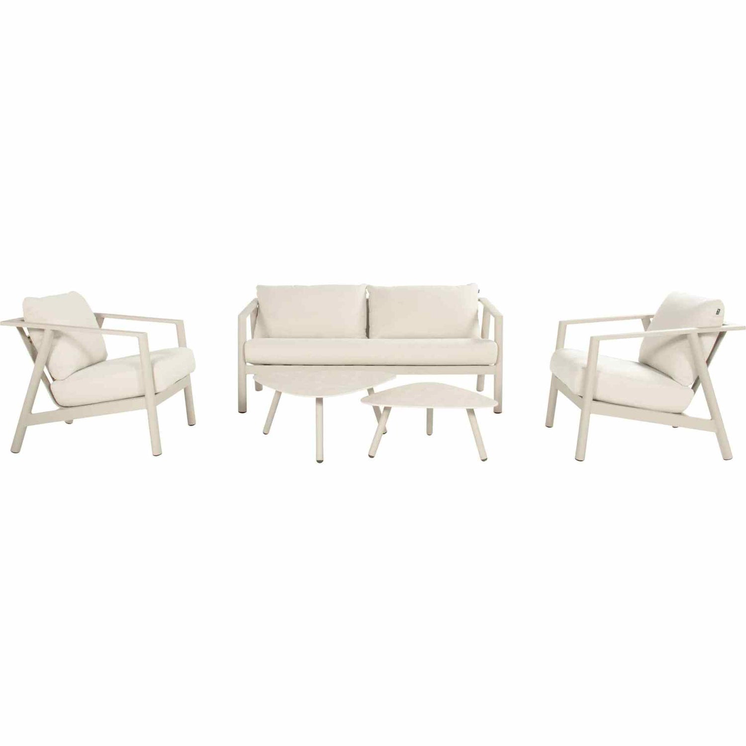 Rana sofagruppe med bordsett er den perfekte løsningen for avslapning utendørs. Settet består av en komfortabel sofa, to lenestoler og to trekantede bord som skaper en innbydende atmosfære på uteplassen.