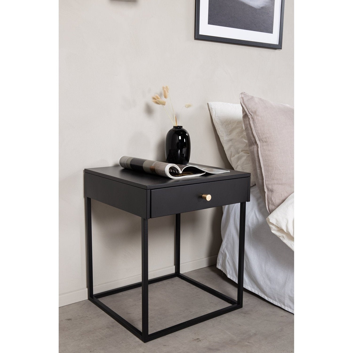 Bedbordene i Bakal-serien tilbyr alt du kan ønske deg både praktisk og overfladisk. Med sin stilige rette nordiske form er designet moderne og luftig. Boksen med messingknott tilbyr jevn lagring for alt du vil ha nært til hånden. Det pulverlakkerte stålet gir nattbordet en elegant finish og gjør det enkelt å matche med annen dekor. Tips: Fungerer bra å plassere som et hjørnebord eller sidebord i stuen også. Lett montering kreves. Pleieanbefaling: Aluminium og krom er to materialer som er avvist mot skitt og væsker. Imidlertid må du være klar over at vann kan forårsake flekker og rust. Derfor må du sørge for å tørke overflaten med en myk fuktig klut og såpevann. Hvis flekkene eller rusten sitter for hardt, anbefales en myk klut fuktet i ren alkohol.