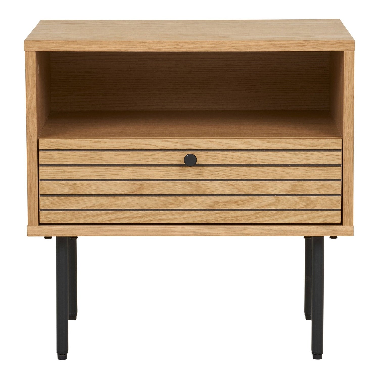 Dette elegante hjørnebordet kombinerer funksjonalitet med stil og er det perfekte tilskuddet til ethvert rom. Bordet er laget av høykvalitets egefiner som gir en naturlig og tidløs estetikk. Den praktiske skuffen gir deg ekstra oppbevaringsplass for småting, slik at du kan holde området ryddig og organisert. De sorte metalbena gir en moderne kontrast til den varme trefinishen, og sikrer samtidig stabilitet og holdbarhet. Dette hjørnebordet er ideelt for å skape en koselig lesekrok, som et nattbord ved siden av sengen, eller som et stilig tilbehør i stuen.