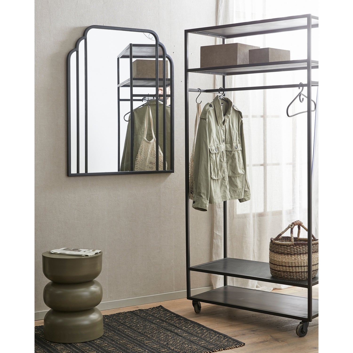 Tidløst speil med en ramme i svartlakkert jern. Speilet kan stå opp mot veggen eller henge både vertikalt og horisontalt.