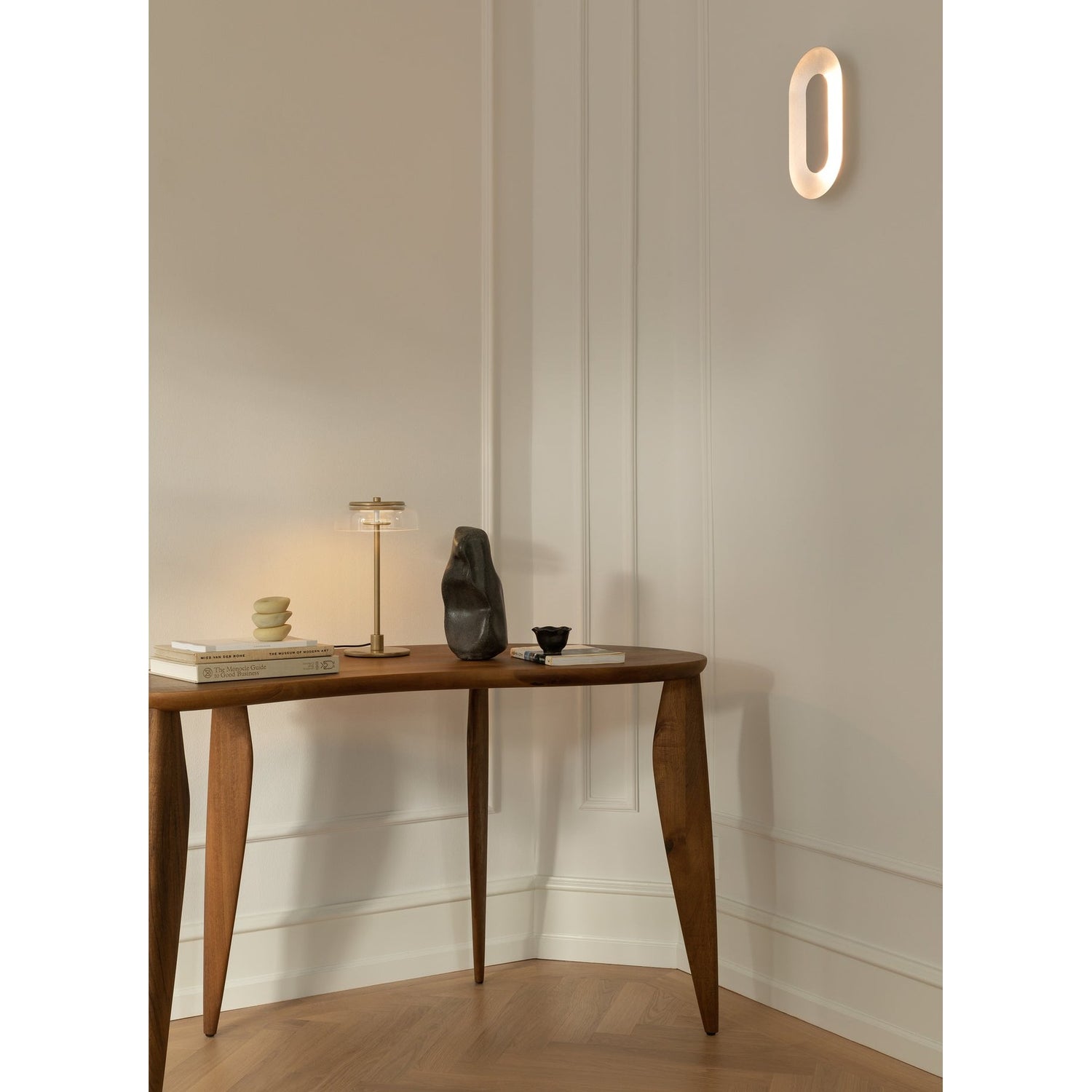 Dekorativ vegglampe i satinmessing designet av Rick Tegelaar for Nuura. De ovale aluminiumskjermene er behandlet med forskjellige overflatebehandlinger, og den subtile kontrasten mellom anodisert og polert metall gjør Sasi vegglampe til et skulpturelt og kunstnerisk element i rommet.