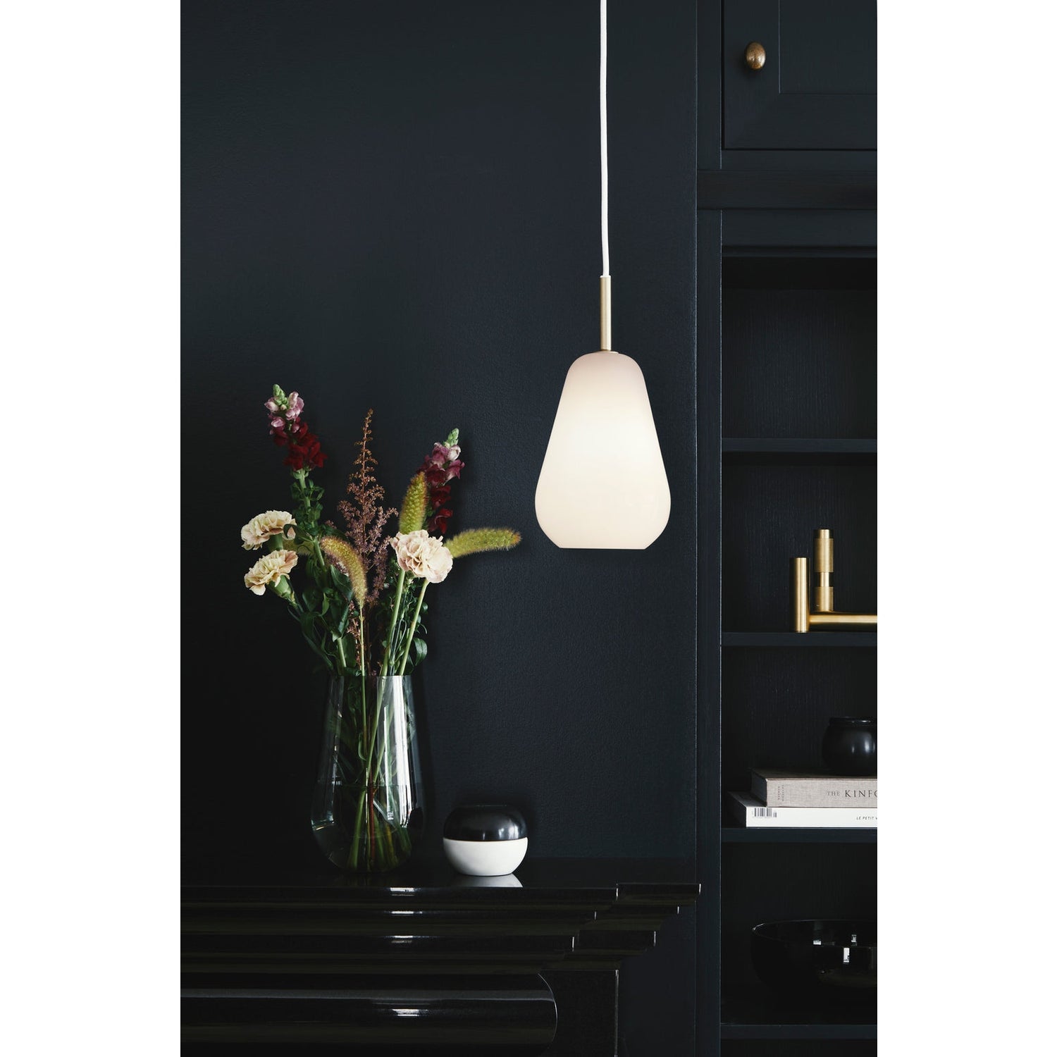 Anoli 1 Small er en enkelt pendel i nordisk design, inspirert av en enkelt regndroppe på en høstdag. Anoli 1 Small har et organisk utseende, og dråpe-skjermen er laget av pent munnblåst glass i en opalhvit farge med referanser til nyfallet snø. Pendelen har detaljer i gullmetall og er ferdig med en hvit stoffdekket kabel.