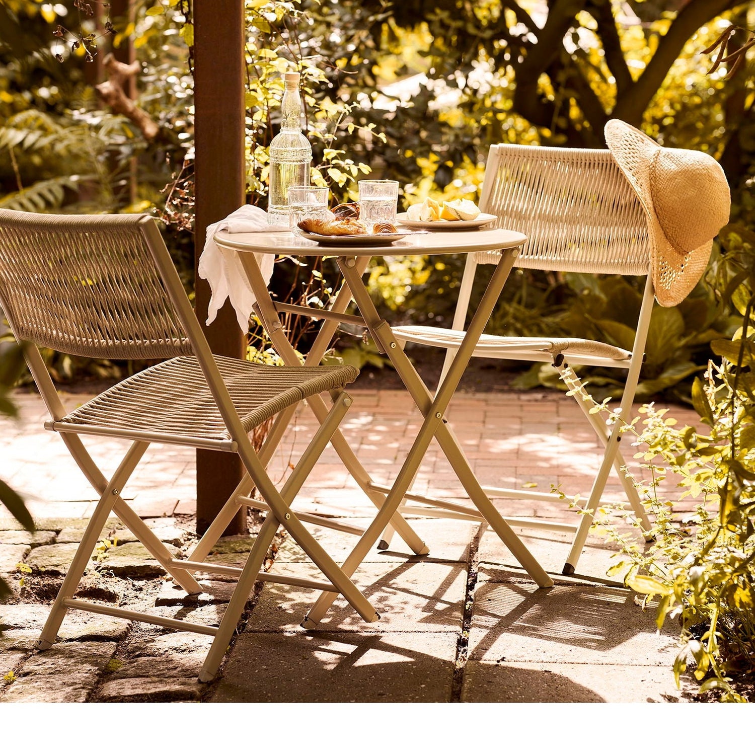 Arcas Bistro Sett er et elegant bistrosett bestående av to stoler og ett bord. Laget av polyester og stål, kombinerer dette settet holdbarhet med enkel vedlikehold. Det er perfekt for utendørs bruk og tilfører en stilren atmosfære til terrassen eller hagen. Nyt måltidene med komfortable stoler og et praktisk bord, ideelt for koselige samlinger.