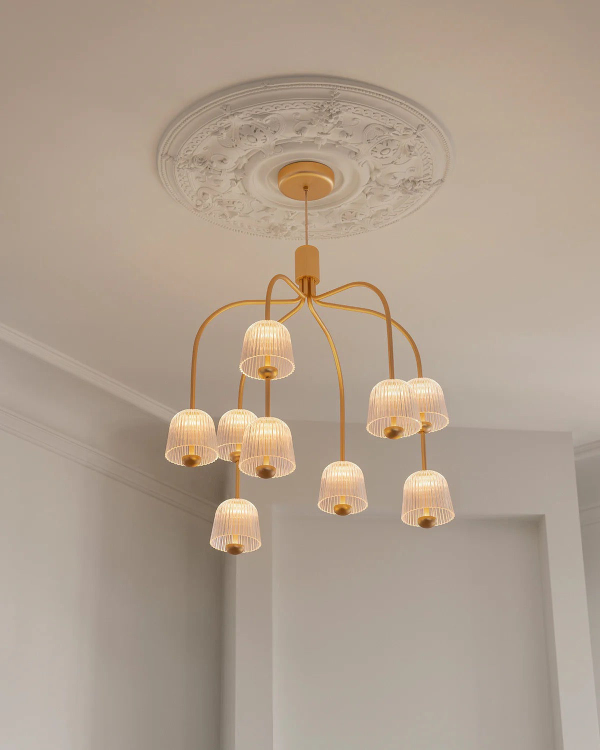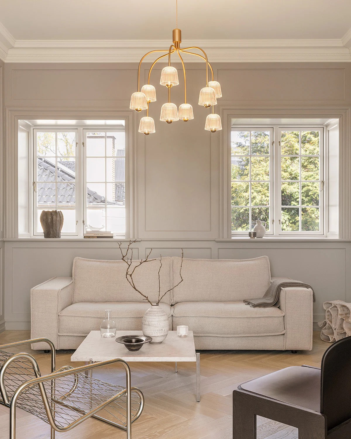 Denne stilrene pendellampen forener moderne estetikk med tidløse materialer. Rammen i satengmessing gir et eksklusivt og elegant uttrykk, mens den rillede, klare glasskjermen sprer lyset på en myk og dekorativ måte. Lampen er utstyrt med en utskiftbar LED-lyspæreholder, noe som gjør det enkelt å tilpasse lysstyrken og forlenge lampens levetid. Den gullfargede kabelen tilfører en raffinert detalj som kompletterer lampens helhetlige design.