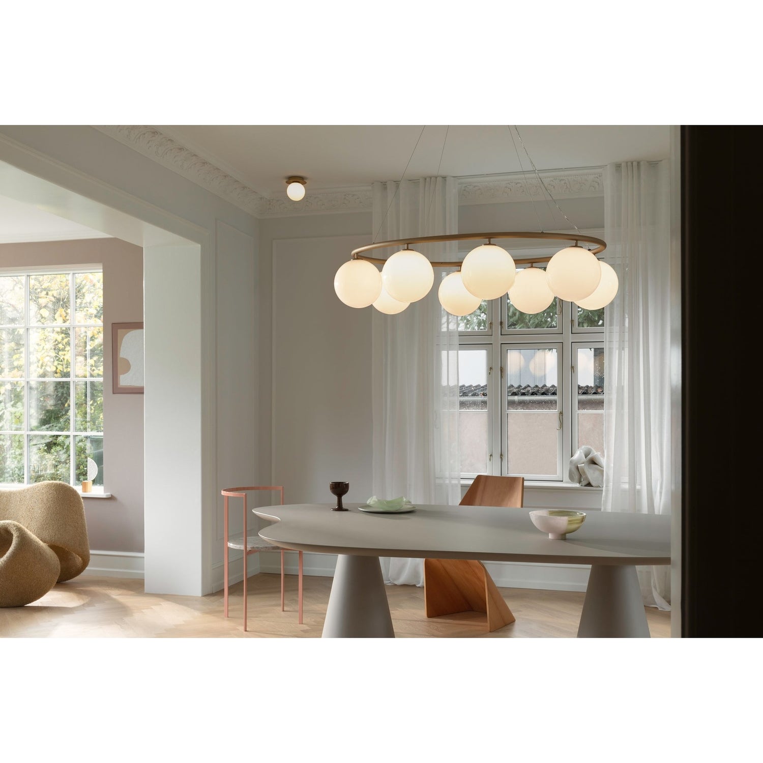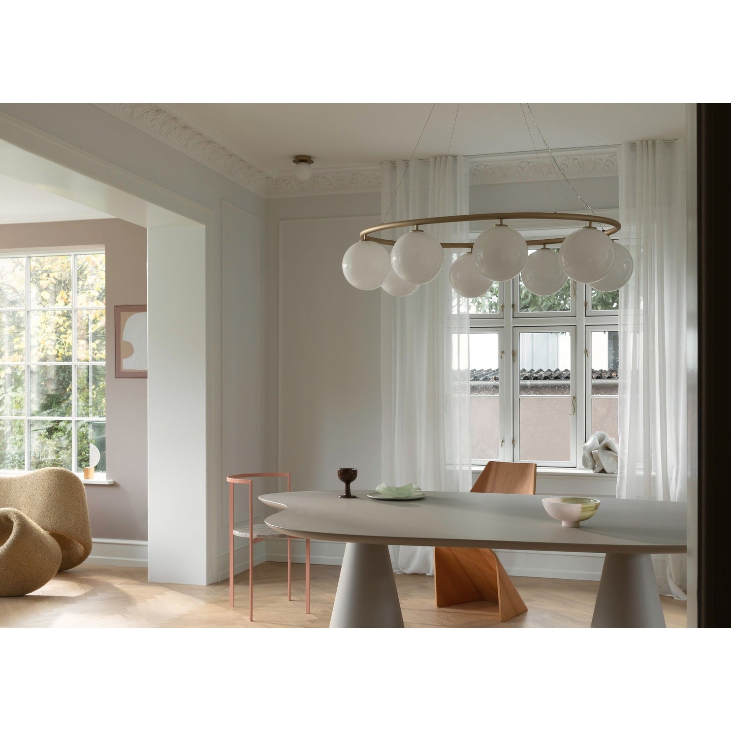 Miira 8 Oval er en moderne lysekrone i et organisk design. Et ekte midtpunkt laget av kontrasterende, men komplementære materialer. Lysekronen henger i et spesielt wiresystem, som gjør at den kan settes i den ideelle høyden for ethvert rom. Den ovale ringen gjør lysekronen til et passende valg for et langt spisebord eller over en kjøkkenøy.