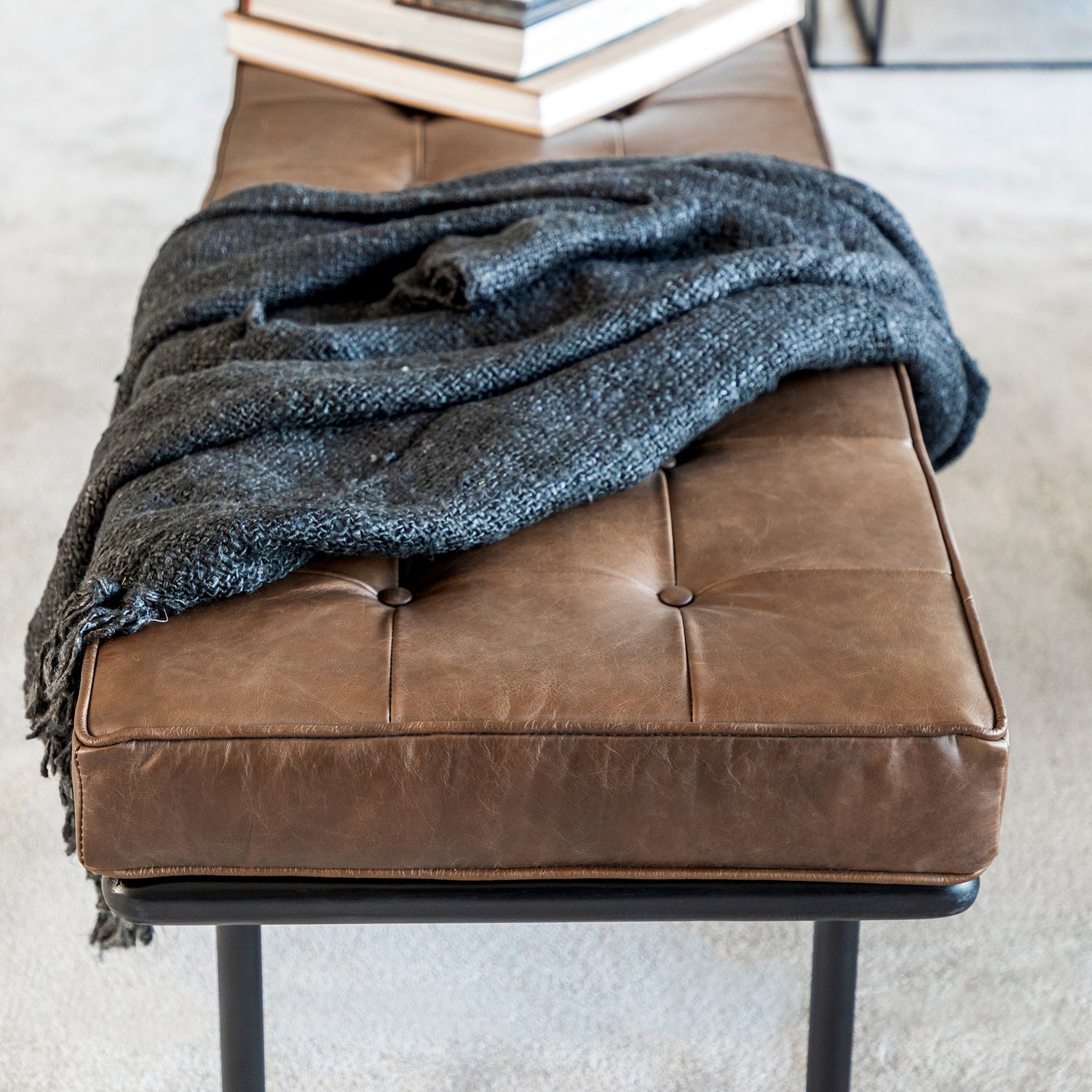 Oppdag vår eksklusive benk med tidløs og moderne design. Den robuste metallrammen gir stabilitet og et stilrent utseende, mens den myke setepolstringen i høyverdig ekte lær tilbyr komfort. Perfekt for entreen, stuen eller soverommet, tilfører denne benken både funksjonalitet og eleganse til hjemmet ditt. Lærmaterialet er slitesterkt og får en vakker patina over tid.