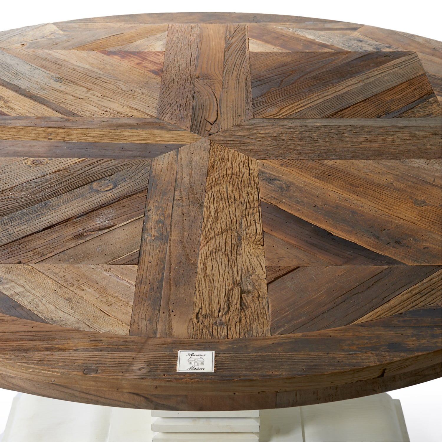 Crossroads-bordene er alltid runde modeller. Kombinasjonen av de vinklede, men elegante benene med den runde, innfelte bordplaten er spesiell. Bordplatene er laget av gammelt alm-tre, bena er laget av poppeltre.