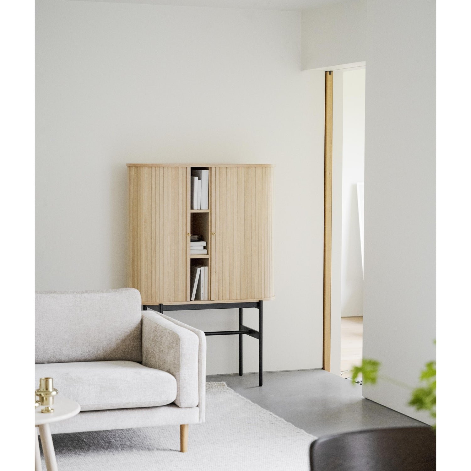 Haddington skap er en stilfull og moderne oppbevaringsløsning som passer perfekt inn i ethvert hjem. Med sin elegante ovale form og smarte skyvedører, gir dette skapet både funksjonalitet og estetikk. De stilige knottene i messing gir et luksuriøst preg, mens de høye bena i svart pulverlakkert metall gir en luftig følelse til rommet.