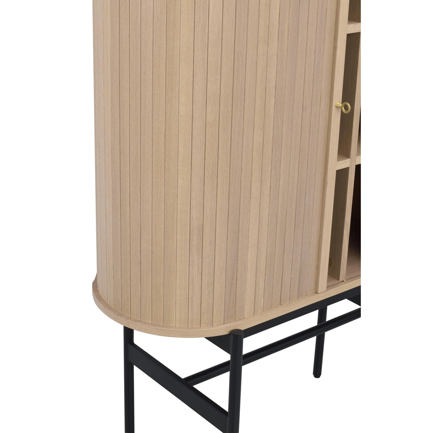 Materiale: MDF med eikefiner, massivt eik i detaljer som stripene i dørene. Pulverlakkert metallbase i sandstruktur.