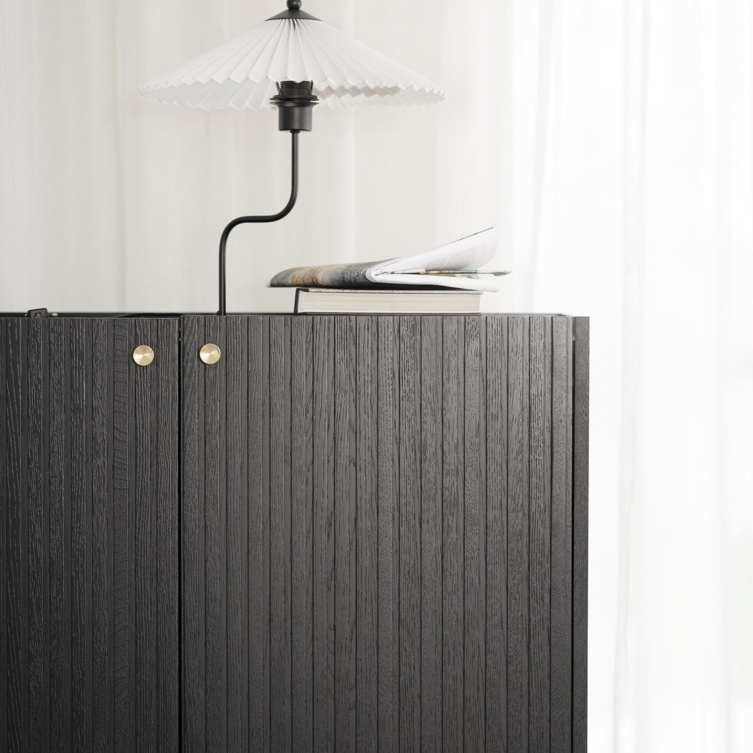 Materiale: Eikefiner på MDF. Massiv eikestykker på forsiden. Ben i pulverlakkert metall med sandstruktur. Knotter i børstet metall med gullfinish.