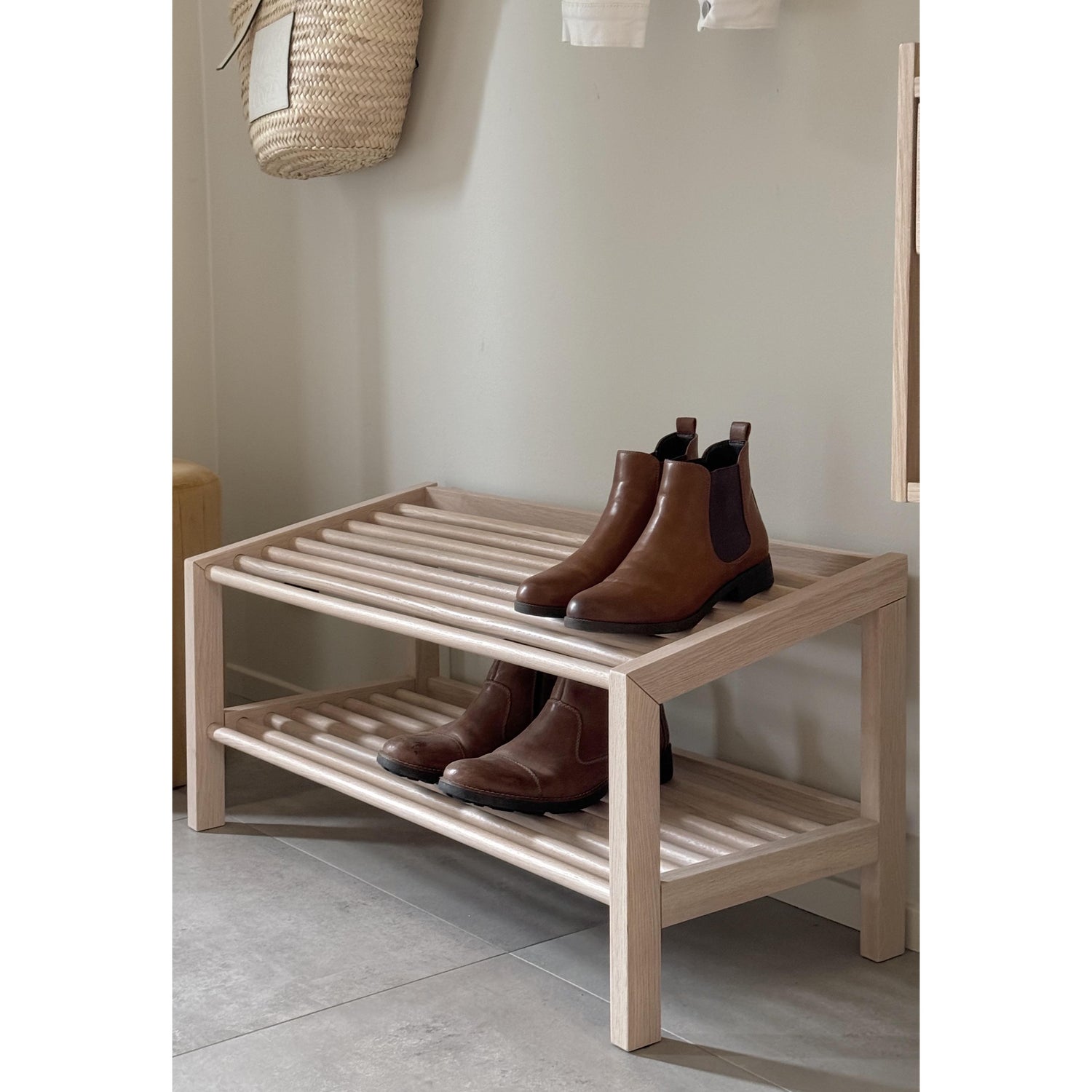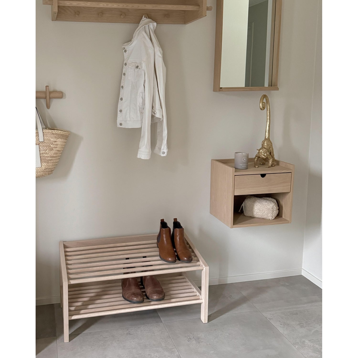 Hillmond skohylle i lakkert massiv eik er den perfekte løsningen for å organisere skoene dine med stil. Denne skohyllen har to hyller, hvor den øverste hyllen er lett skråstilt, noe som gir et unikt og moderne preg. Hillmond-kolleksjonen er kjent for sin høye kvalitet og vakre tre detaljer, samt sitt skandinaviske design.