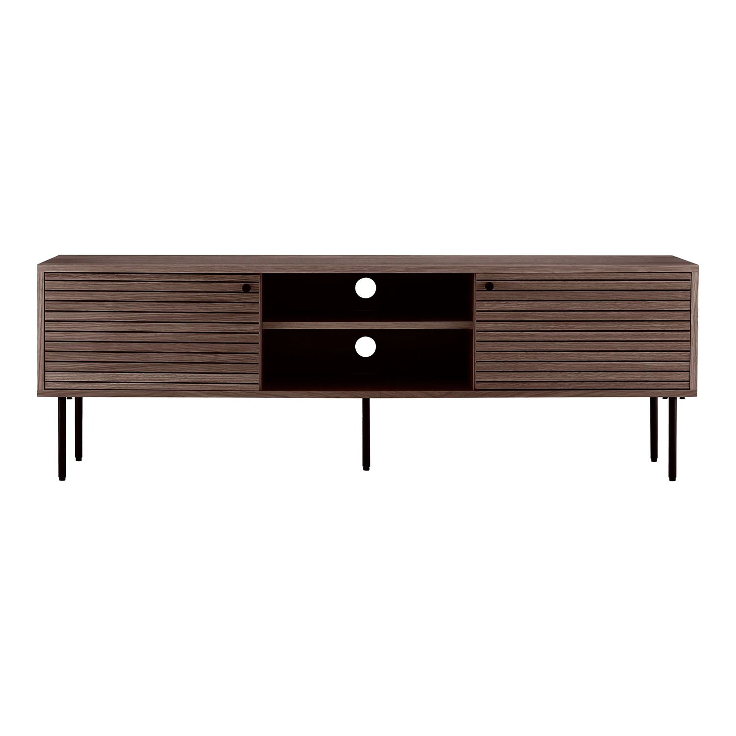 Kyoto TV-benk er en stilren og funksjonell møbelbit som passer perfekt inn i moderne hjem. Laget av eikefiner og MDF, gir denne TV-benkens naturlige eikefiner et varmt og innbydende preg. Den har to romslige dører som skjuler oppbevaringsplass for fjernkontroller, spillkonsoller eller andre medier, samtidig som to åpne hyller gir enkel tilgang til bøker, dekorasjoner eller elektronikk. De elegante svarte metallbeina gir et moderne preg og sikrer stabilitet. Med dimensjoner på 150x40x50 cm er Kyoto TV-benk både praktisk og stilfull, og den vil være et flott midtpunkt i stuen din.