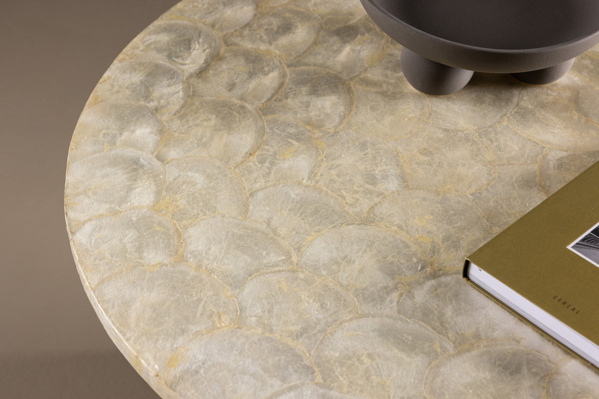 Smögen er et elegant bord laget i det vakre naturmaterialet Capiz. Bordene kommer i ulike størrelser – et større bord med diameter på 70 cm og et mindre bord på 40 cm. Sammen danner de en fleksibel og tidløs løsning som passer perfekt i både moderne og klassiske hjem. Kjøp alene eller sammen i sett.