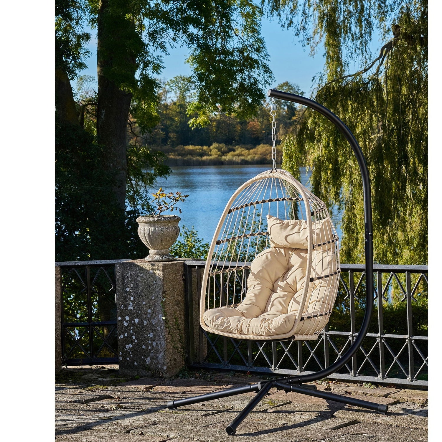 Patras hengestol er en stilren hengestol med stålstativ og et praktisk sammenleggbart sete. Den leveres med puter som gir ekstra komfort, noe som gjør den perfekt for både innendørs og utendørs bruk. Hengestolen er enkel å sette opp og oppbevare, og tilfører et innbydende preg til ethvert rom eller uteområde. Den er en ideell løsning for avkobling og hyggelige stunder.
