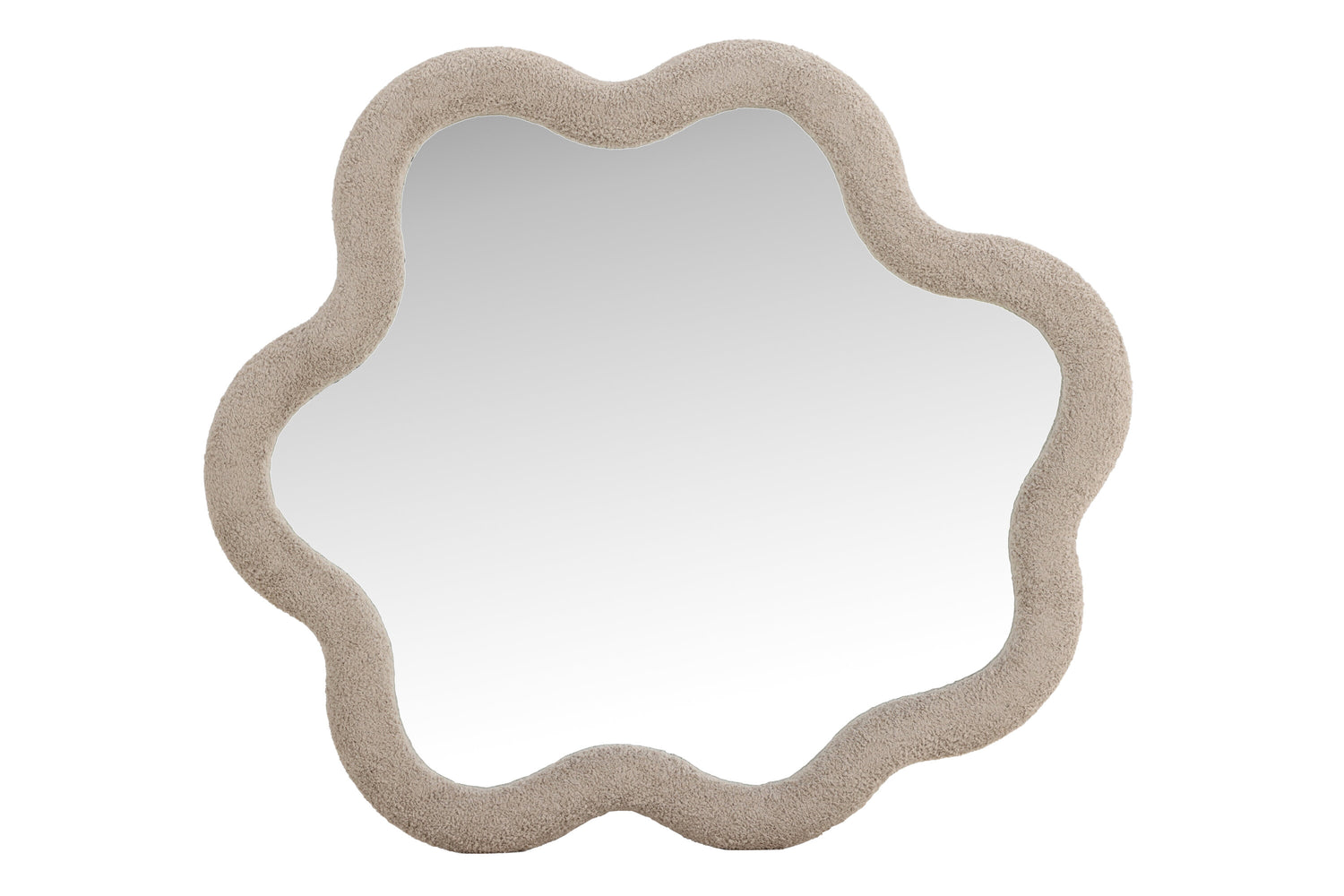 Med generøse dimensjoner på 70x70 cm er Kungsbacka en dekorativ blikkfang, samtidig som det har en praktisk funksjon i hverdagen. Rammen er dekket med bouclé-stoff som fremhever speilets innbydende og trendy karakter.