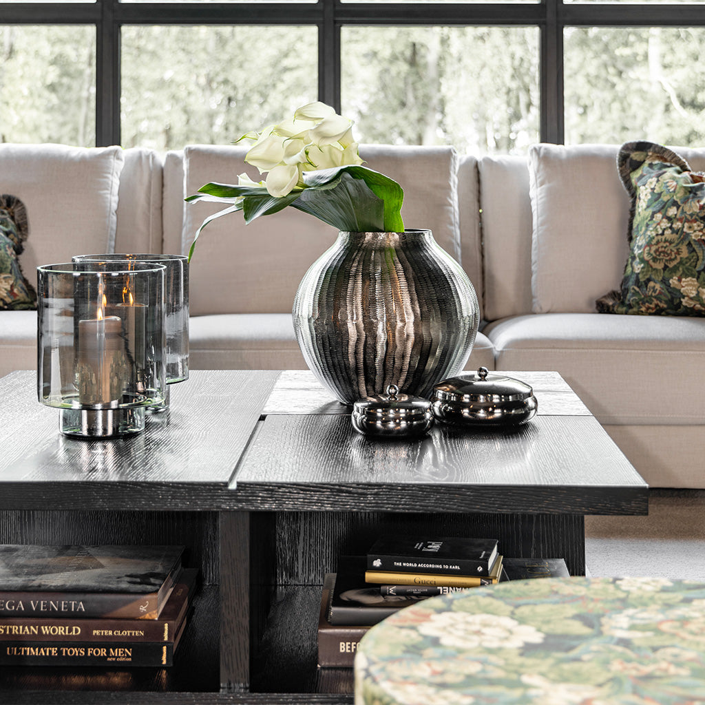 Tenk på at overflatene er følsomme for sterke rengjøringsmidler. Bruk derfor alltid underlag under glass, kopper, vaser mm. Tørk forsiktig med lett fuktig klut.