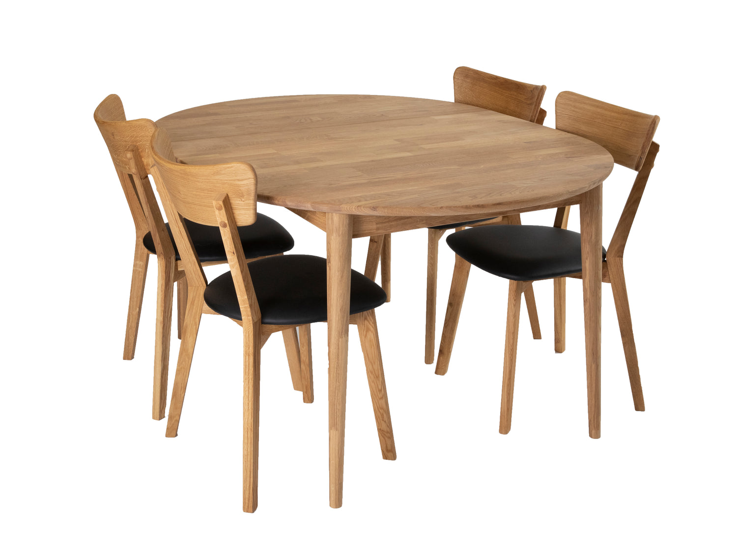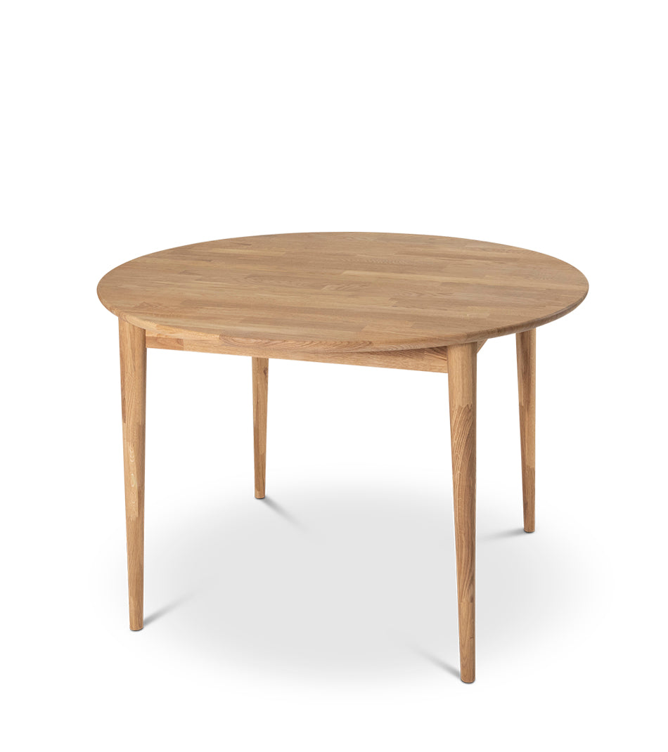 Alborg 110/150 spisebord Stilig rundt spisebord i massiv eik. Den medfølgende ileggsplaten(40cm) gjør at bordet kan forlenges til 150 cm, og gir plass til større selskap ved behov. Perfekt for både hverdagsbruk og festlige anledninger. Gjør måltidene dine mer sosiale med dette elegante bordet.