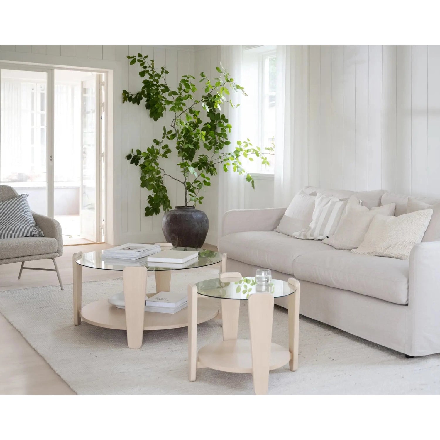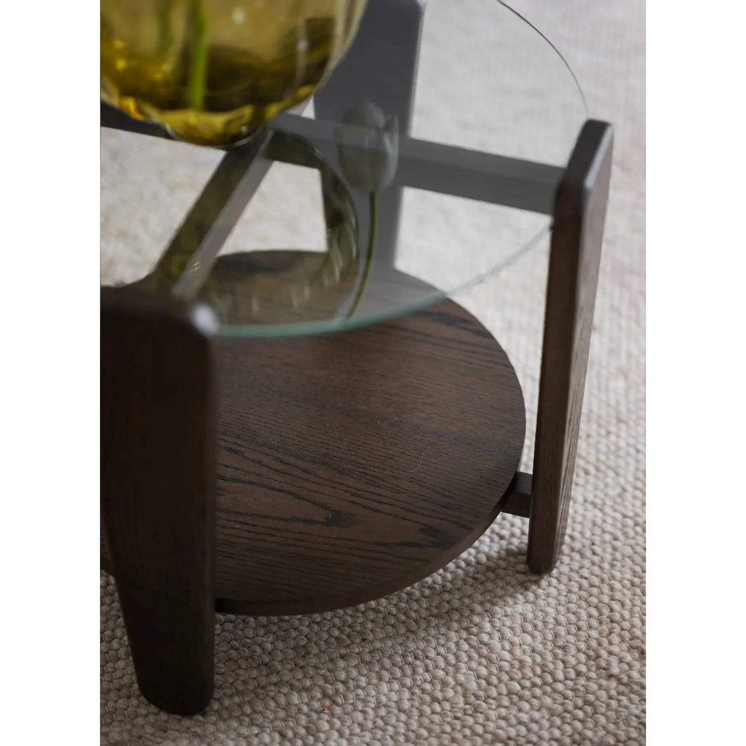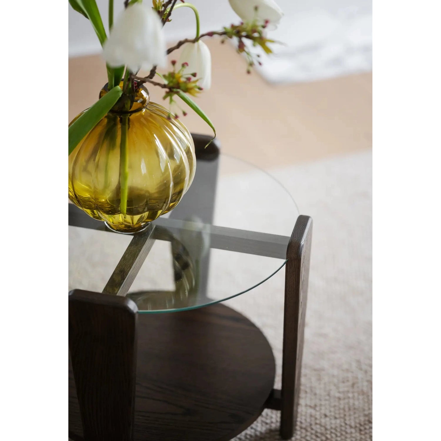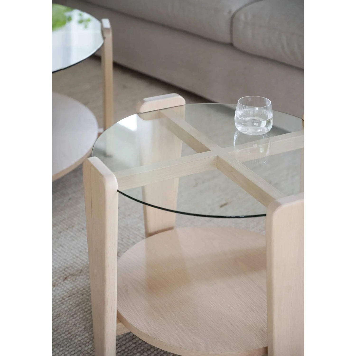 Oppdag Arran kaffebord Ø52, et elegant og moderne møbel som kombinerer skandinavisk design med funksjonalitet. Dette kaffebordet har en stilren glassplate som møter en solid eikebase, noe som skaper en smakfull kontrast og gir et sofistikert preg til stuen din.