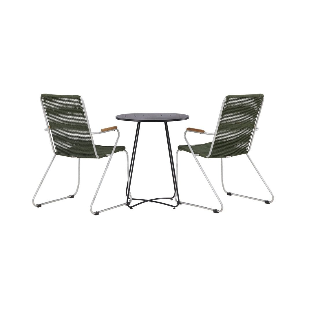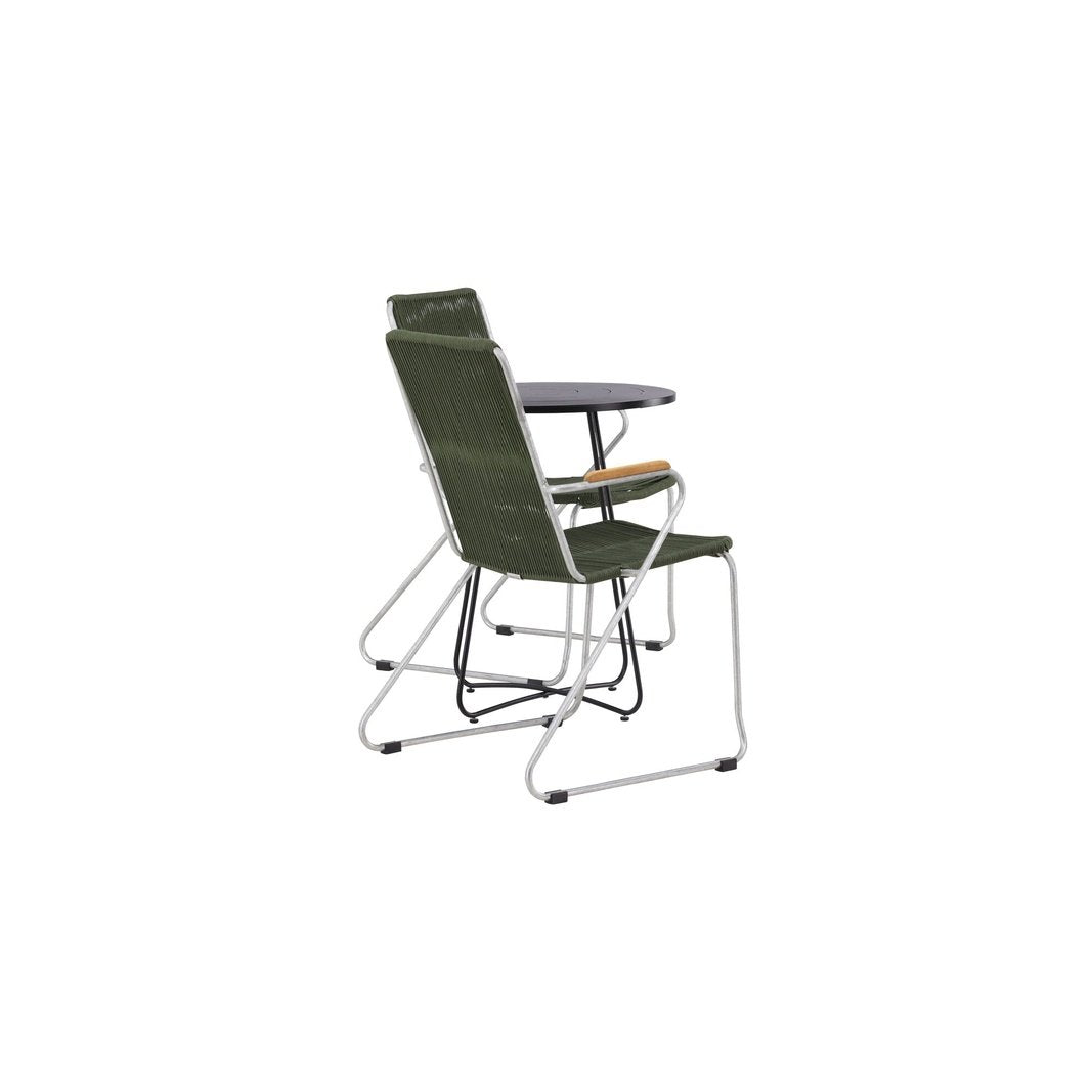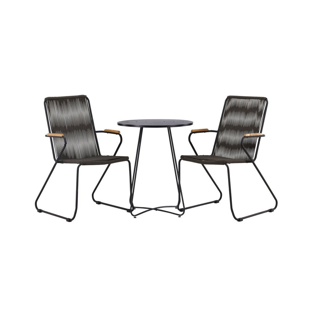 En fantastisk spisegruppe som er perfekt for alle kaffepauser denne sommeren! Den sjarmerende kafébordet fra Bacong-serien har en rund topp og slanke ben i svart stål. Her sammen med 2 stilige spisestoler fra Bois-serien. Stolen har en komfortabel design med armlener i teak og mørk grå sete i tau. Sitte komfortabelt og slappe av denne sommeren! Borddiameter: 6cm.