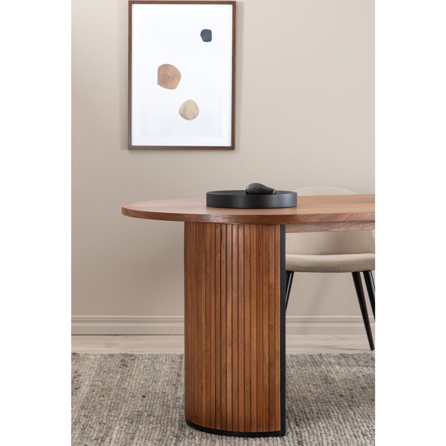 Bianca skaper en stilig blikkfang som imponerer! Dette ovale spisebordet har en moderne design med en MDF bordplate og en robust ramme i rillet design som gir et solid inntrykk. Hev interiørdesignet i stuen og inviter til mange hyggelige måltider fremover! Pleieanbefaling: MDF-plater som er malt eller lakkert er sensitive for riper og skader. Vær derfor forsiktig med platene for å unngå dette. Overflater malt med lakk eller maling har en pigmentering som gir en ikke-dekkende gjennomsiktig overflate.