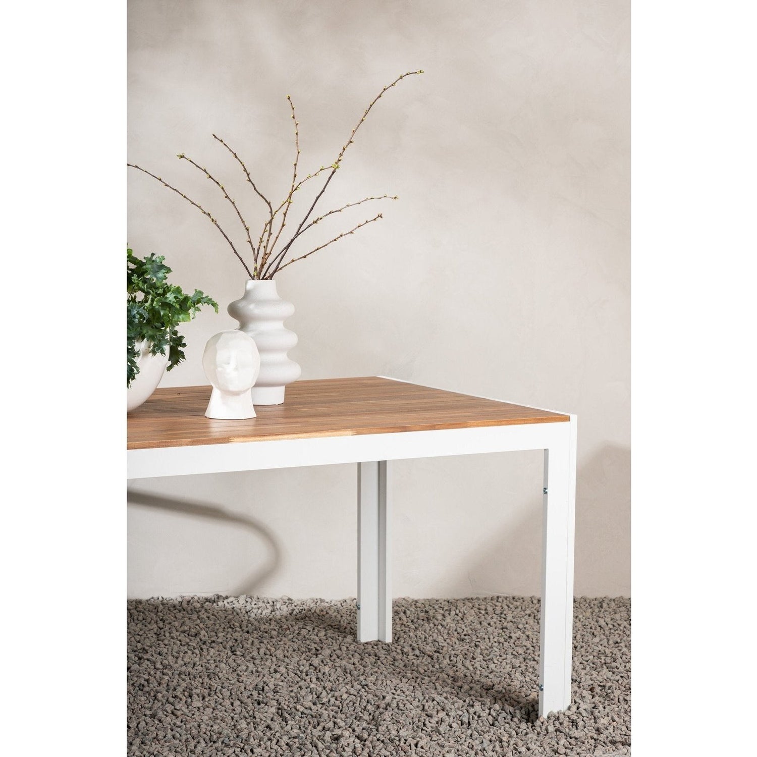 Spisebordet Bois imponerer med sine rette nordiske former og klassiske design! Bordplaten er i dekorativ akasie og bordbenene i stilig hvitt metall. Match med et par deilige spisestoler slik at du får en komplett matgruppe å samle venner og familie rundt - gjør deg klar for måltider utendørs og nyt hyggelig selskap denne sommeren! Pleieanbefaling: For at utemøblene dine i akasie / hardtre skal beholde finishen sin, bør de behandles med olje. Siden treverket i seg selv ikke er så fett av natur, må det oljes litt nå og da, selv i løpet av sesongen. Nylig kjøpte møbler bør mettes med olje, påfør flere lag etter hverandre slik at det maksimale med olje absorberes. Tørk av det som blir overflødig.