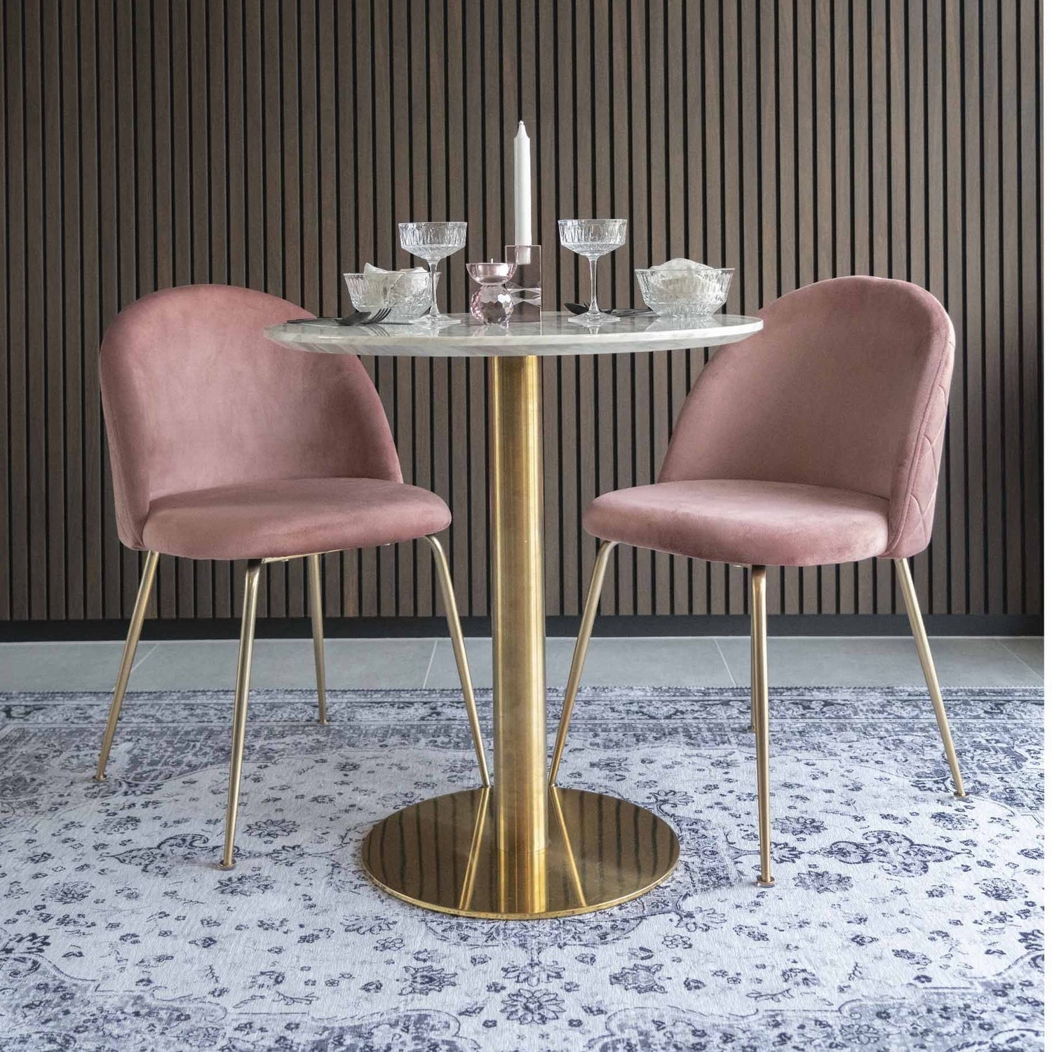 Dette elegante spisebordet kombinerer moderne design med tidløs eleganse. Bordplaten har en sofistikert marmorlook som gir et luksuriøst preg til ethvert rom. Den hvite overflaten skaper en lys og innbydende atmosfære, perfekt for både hverdagsbruk og spesielle anledninger. Basen i messinglook tilfører en touch av glamour og stabilitet, og skaper en harmonisk kontrast til den lyse bordplaten. Dette spisebordet er ideelt for mindre rom eller som et stilig tillegg til en større spisestue, og vil garantert bli et blikkfang i ditt hjem.