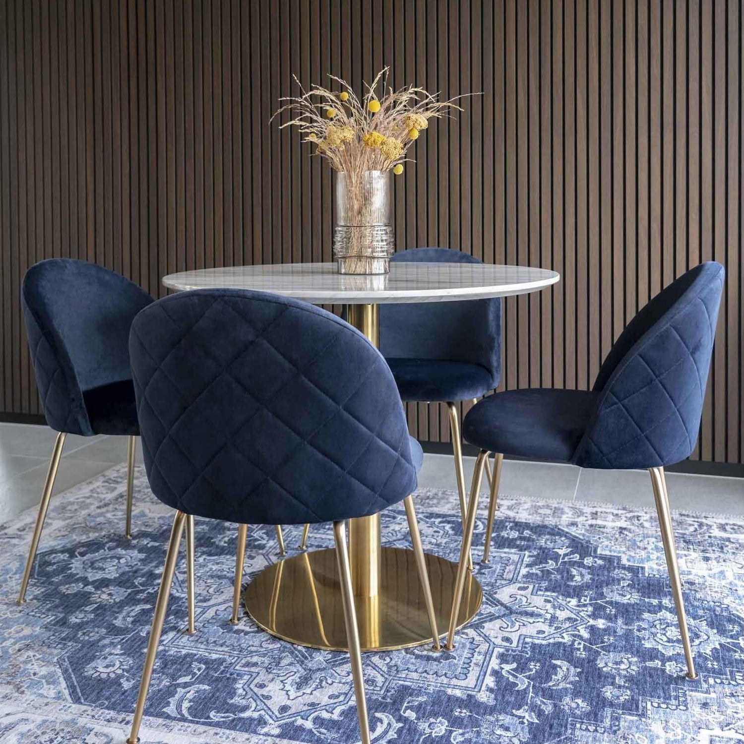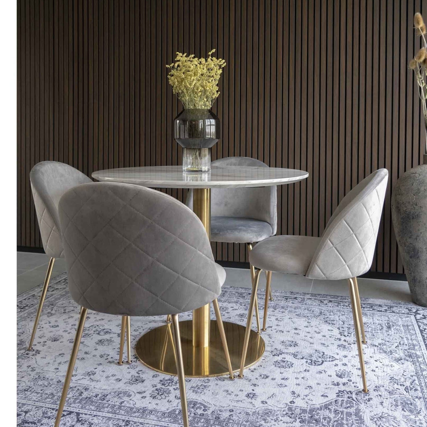 Dette elegante spisebordet kombinerer moderne design med tidløs eleganse. Bordplaten har en sofistikert marmorlook som gir et luksuriøst preg til ethvert rom. Den stilige basen i messinglook tilfører en varm og innbydende glød, samtidig som den gir stabilitet og holdbarhet. Dette spisebordet er perfekt for både hverdagsbruk og spesielle anledninger, og vil garantert bli et blikkfang i ditt hjem.