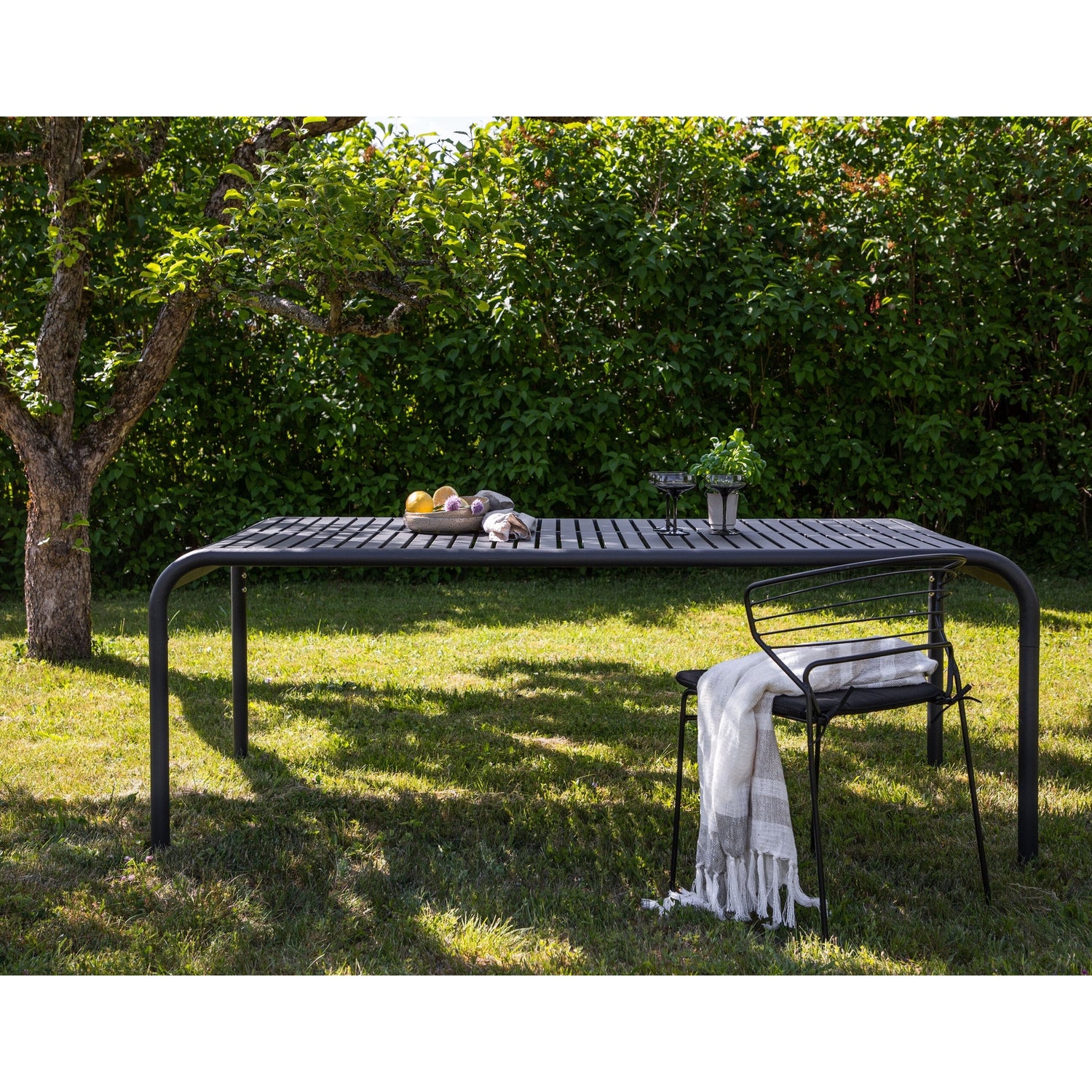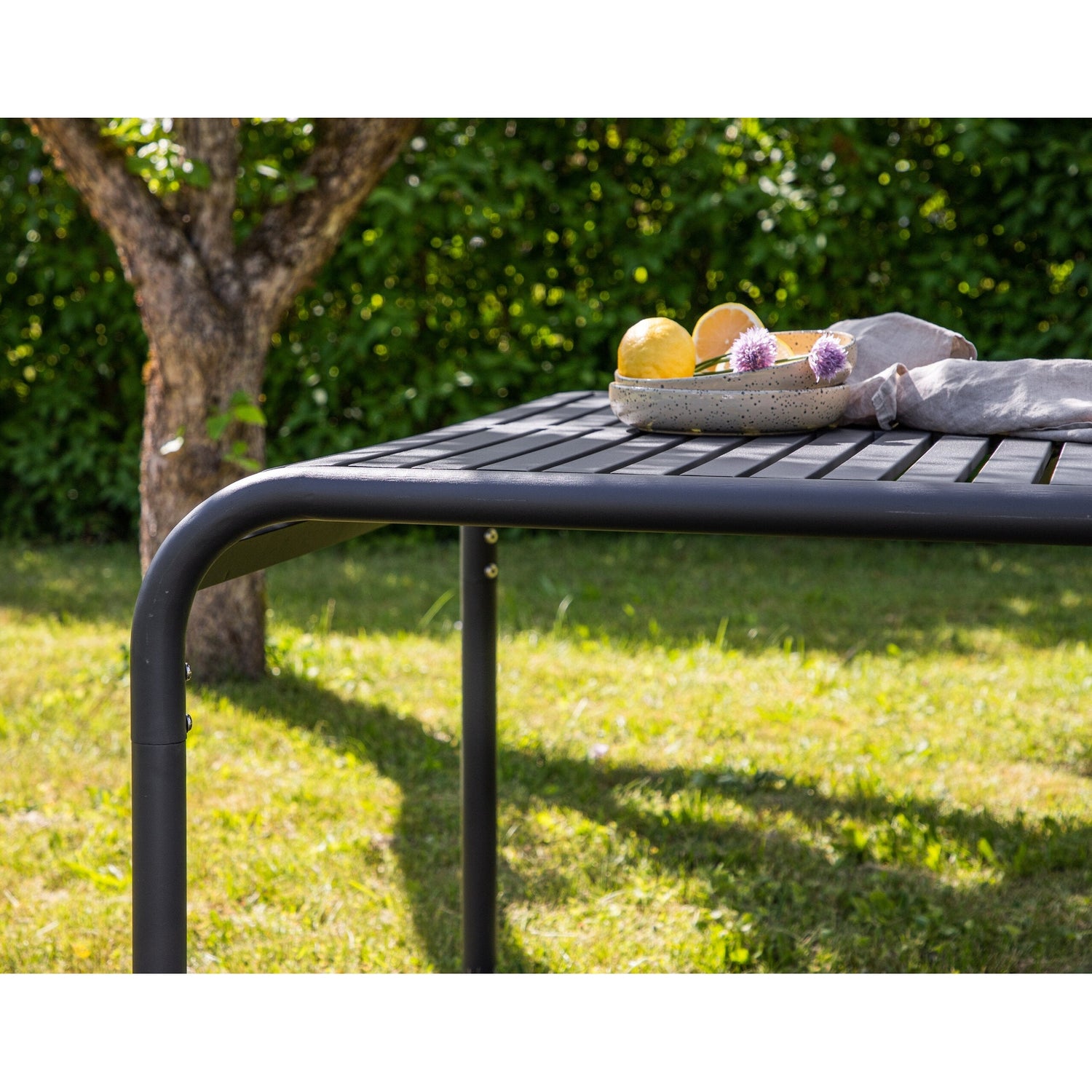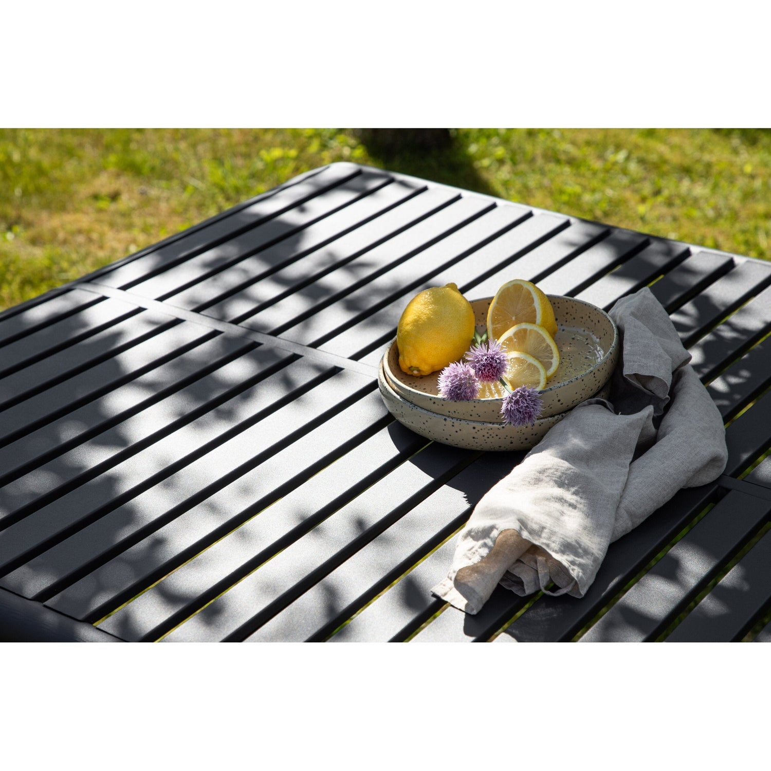 Spisebordet fra Borneo-serien har fleksible former og et tidløst skandinavisk design! Bordplaten er ribbet og bølger langs kantene ved bena. Helt laget av antrasitt aluminium, som gir deg et holdbart bord som er enkelt å flytte rundt. Kombiner med et par komfortable spisestoler, så får du en komplett spisestuegruppe som vil lyse opp herlige måltider på terrassen din!