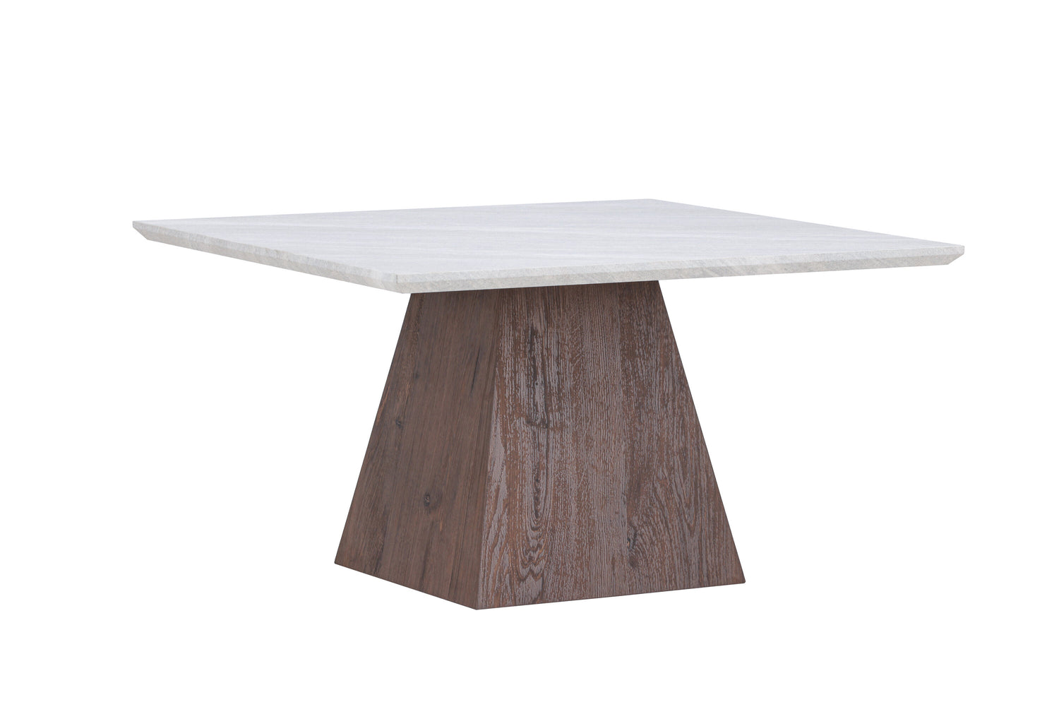 Dette kvadratiske sofabordet kombinerer eleganse med moderne design. Topplaten med marmorutseende gir et eksklusivt og tidløst preg, mens den sentrale benet skaper en varm kontrast som gir bordet karakter. Den stabile basen gir en luftig følelse rundt bordet og tilbyr solid støtte.