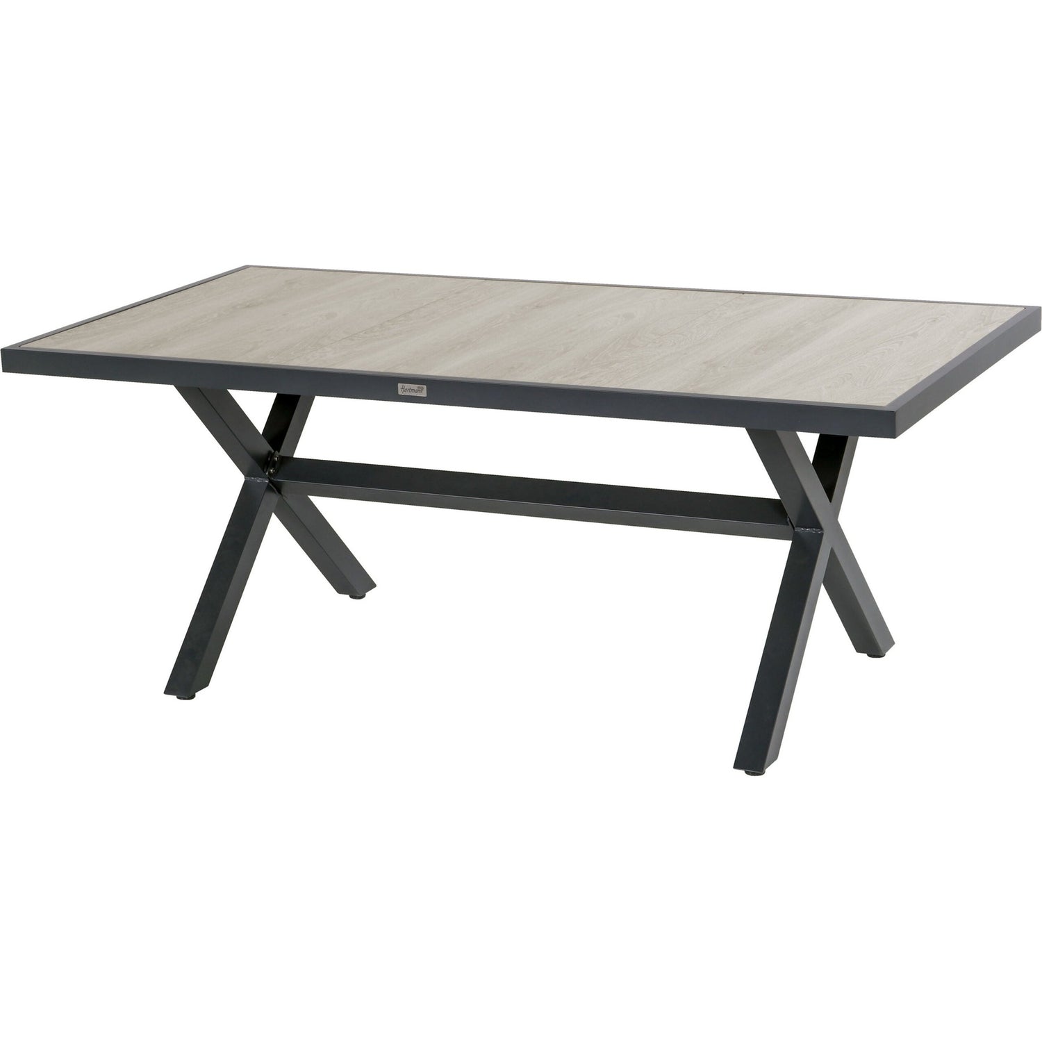 Spisebord med kryssben i hvitlakkert aluminium. Bordplate laget av tre stk keramiske fliser. Flisene kan tas ut. Tåler varierte værforhold og er enkelt å rengjøre.