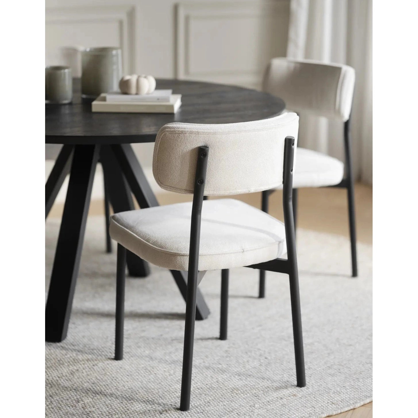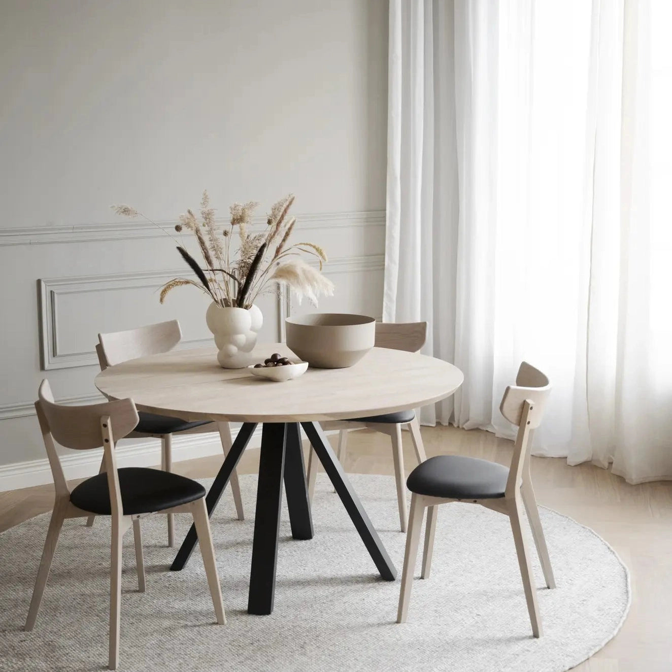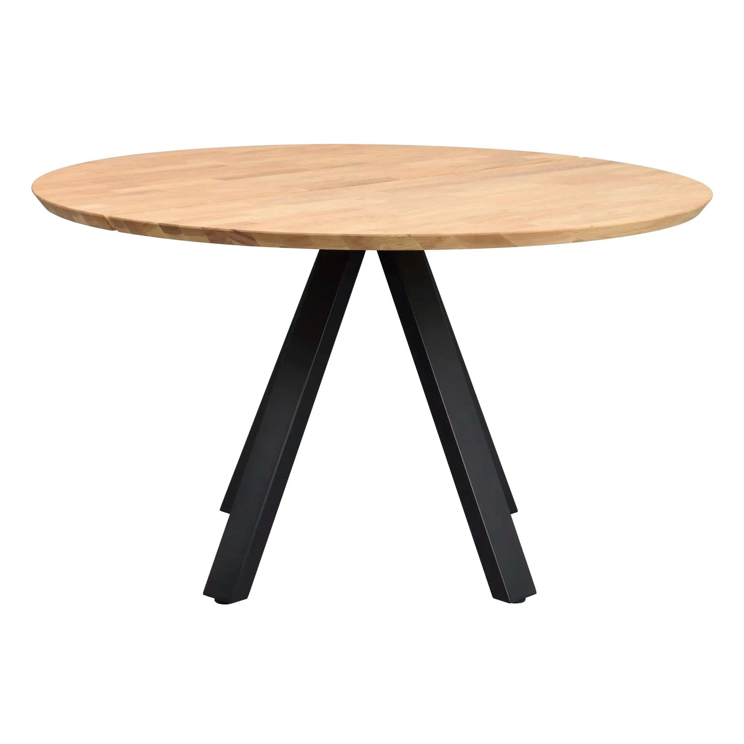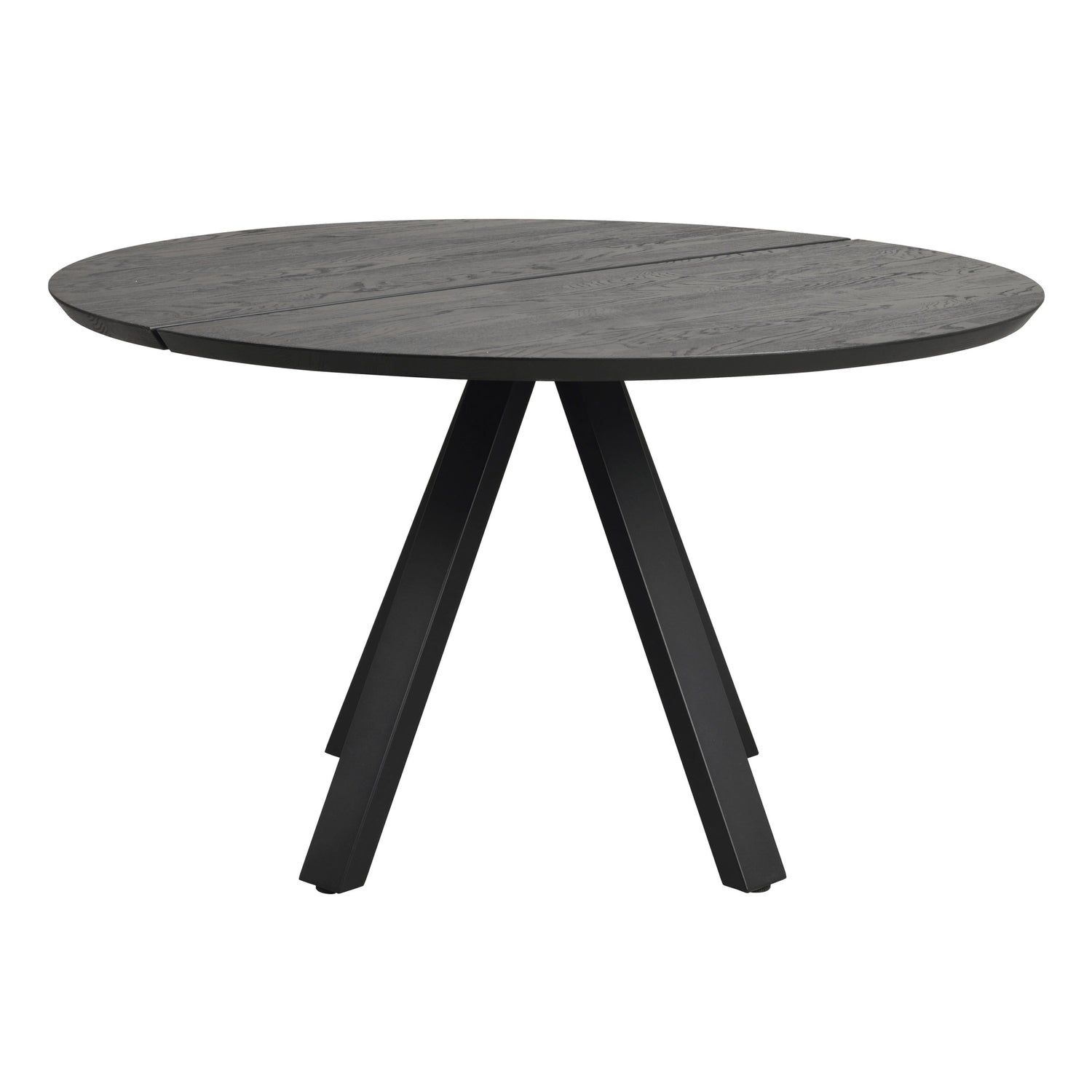 Oppdag Carradale spisebord Ø130, laget av lakkert FSC®-sertifisert eik. Dette stilige spisebordet har en to-delt solid bordplate med en børstet overflate, som gir et moderne og elegant preg til ditt hjem. Bordet støttes av V-formede ben i pulverlakkert svart metall, som ikke bare gir stabilitet, men også et unikt design.