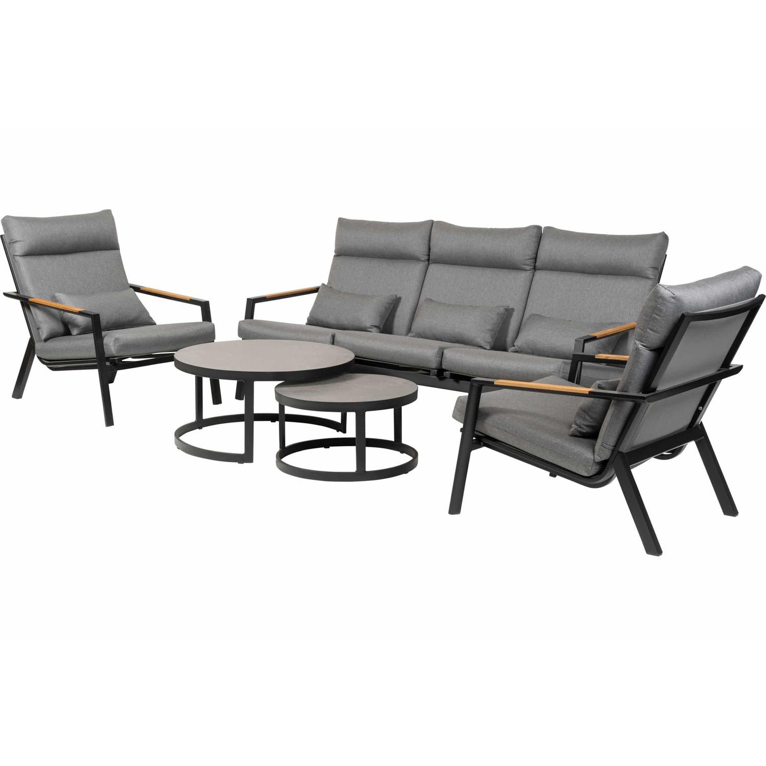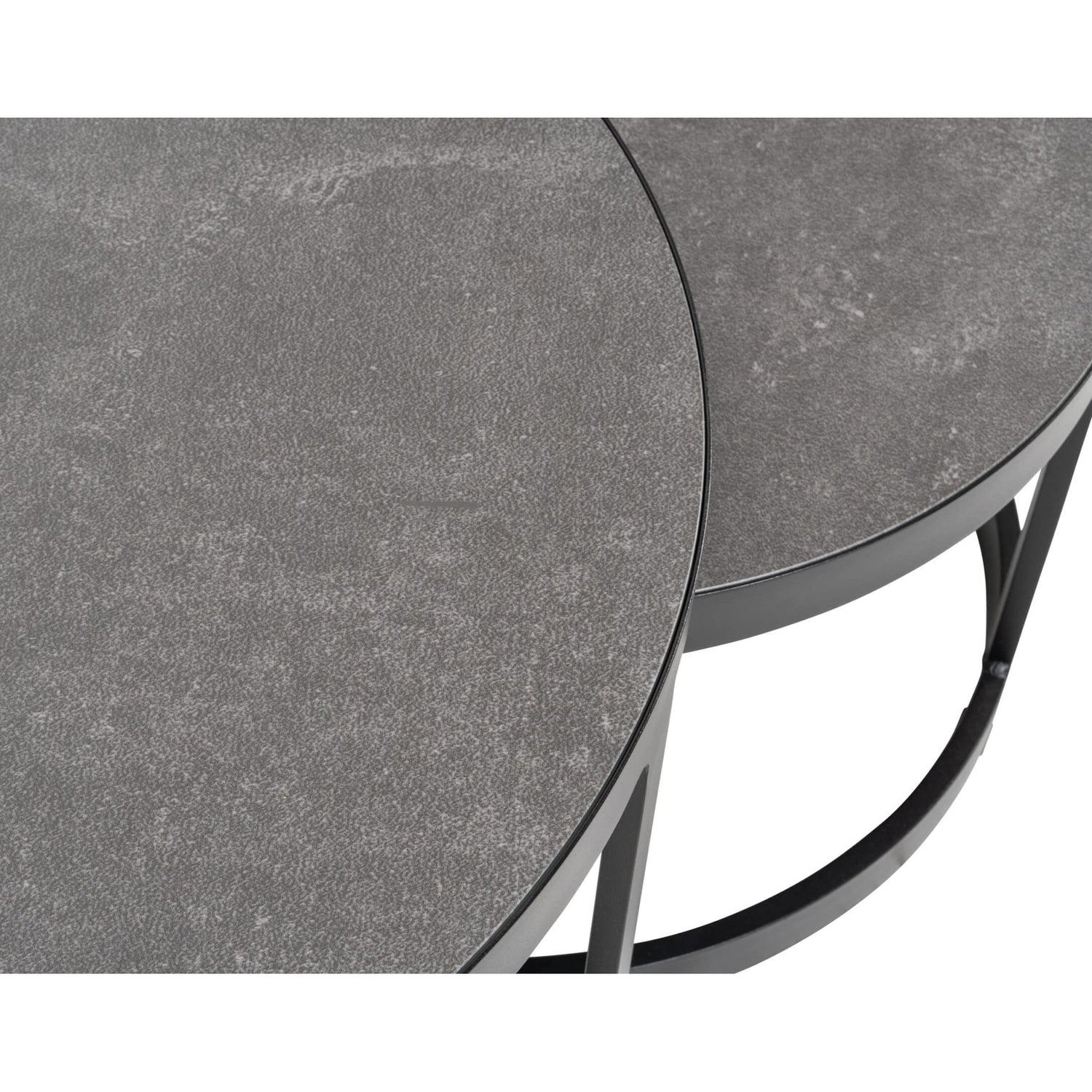 Moderne bordoppsett. Laget i sort pulverlakkert aluminium med bordplater i keramikk. Størrelse stort bord: ø80xh40cm Størrelse lite bord: ø60xh33cm