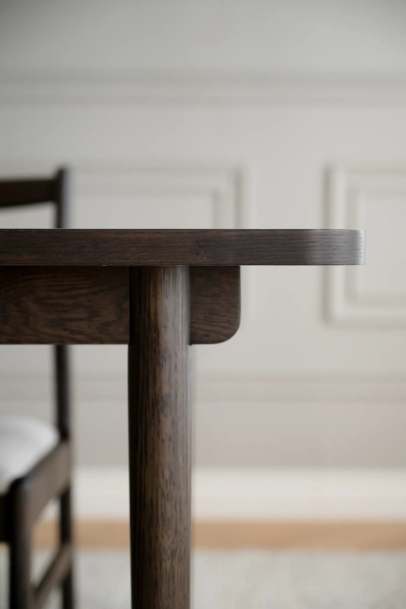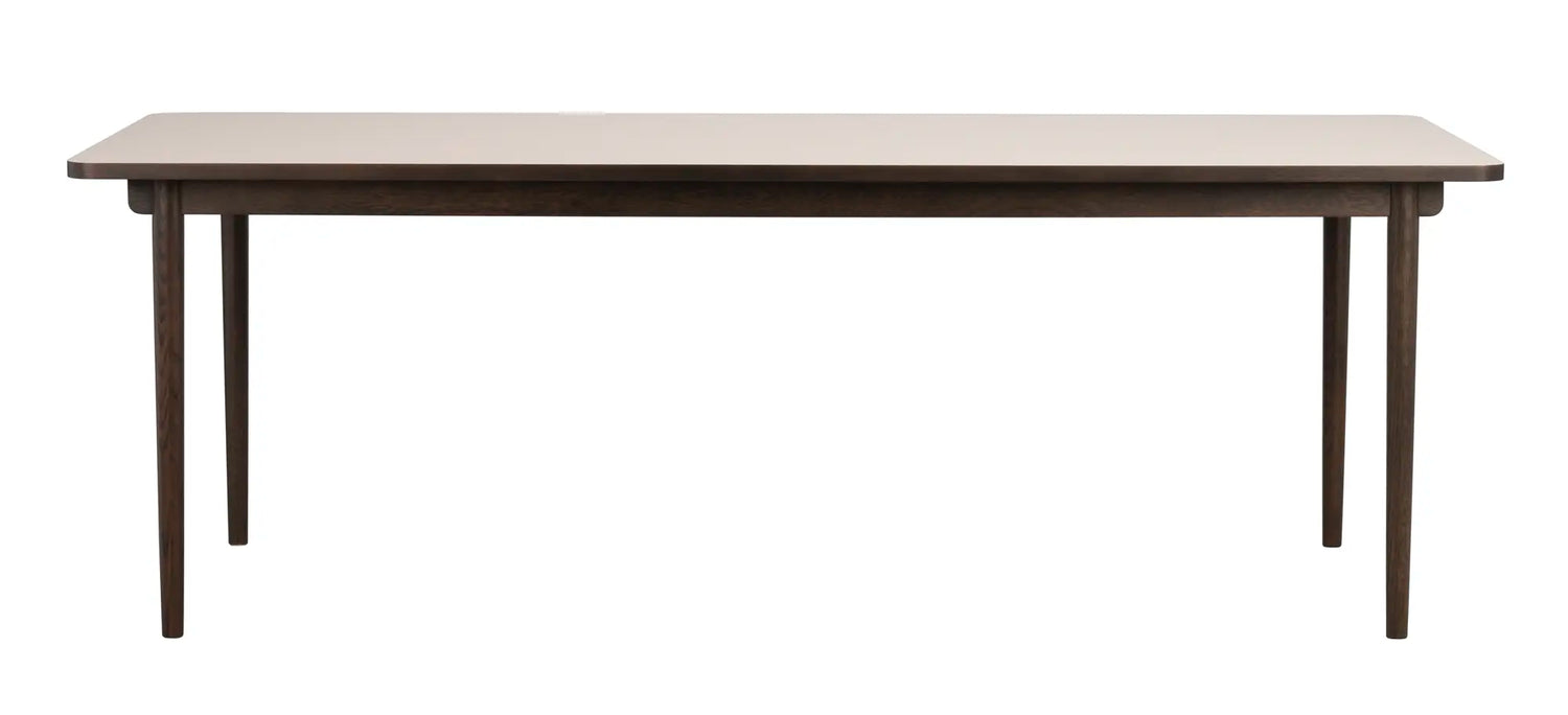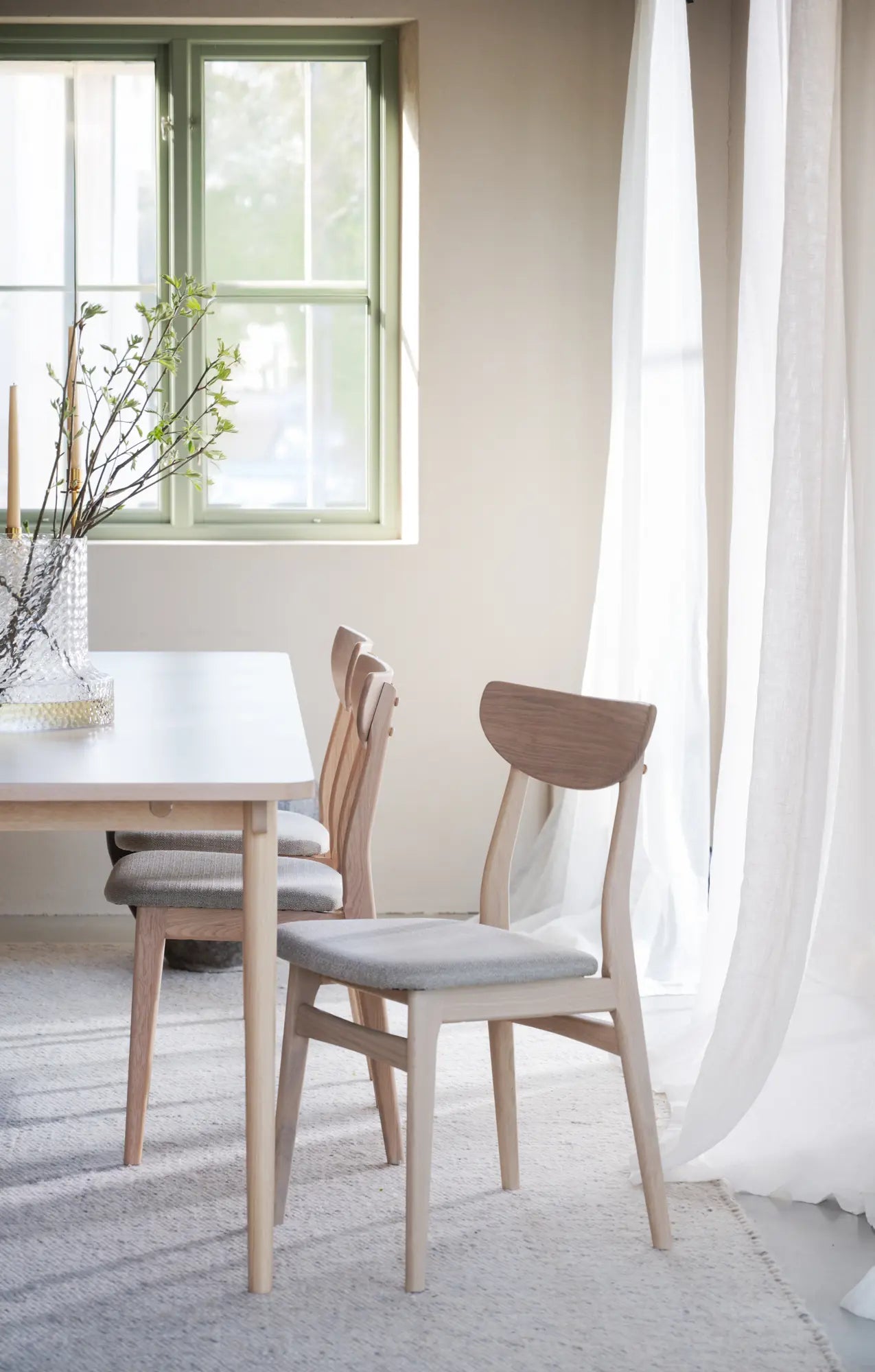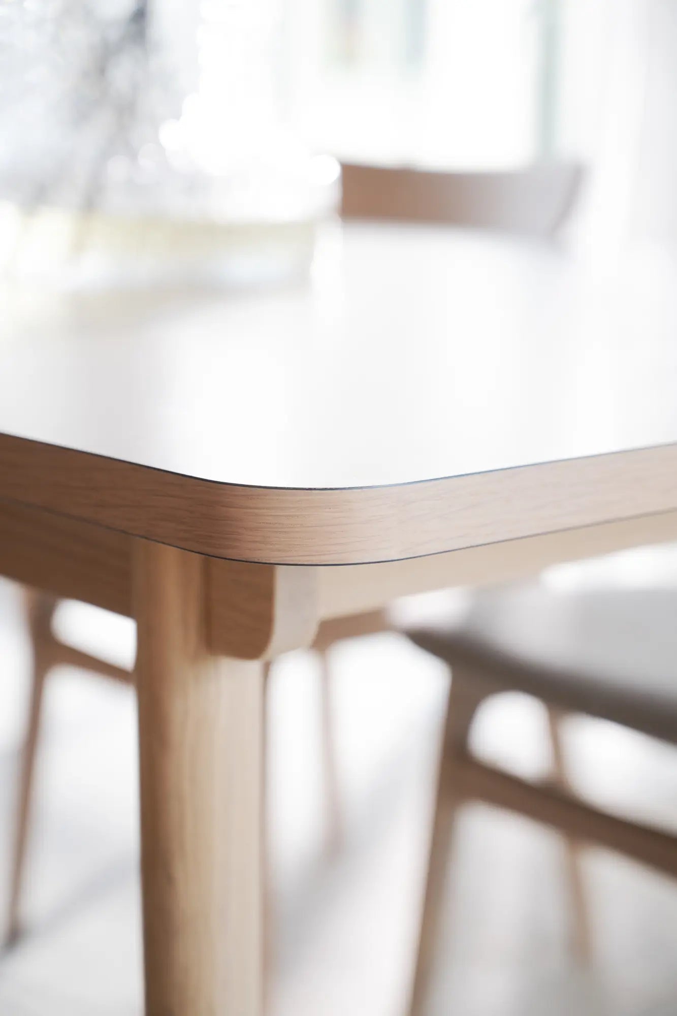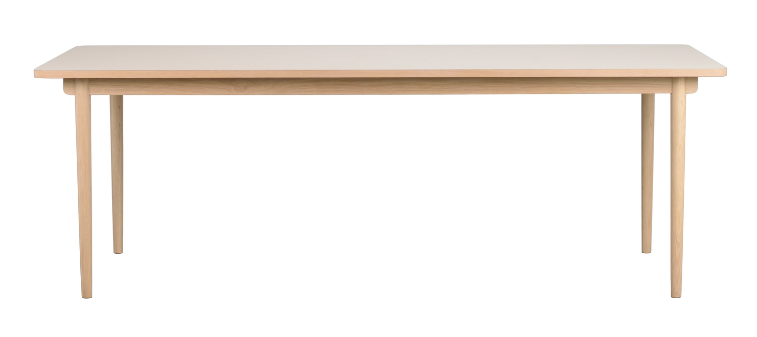 Fairmount spisebord i hvitoljet eik er et elegant bord med et lyst og luftig design som passer perfekt inn i både moderne og klassiske hjem. Bordplaten er laget i slitesterk høytrykkslaminat som er motstandsdyktig mot riper og fukt, noe som gjør bordet like godt egnet til hverdagsbruk som til selskap og festlige anledninger. Den beige bordplaten kombinert med finert kant og ben i solid eik gir en harmonisk helhet og et tidløst uttrykk. En gjennomført detalj er den mykt formede sargen som strekker seg utenfor bena, et raffinert designgrep som gir bordet et unikt og stilfullt preg.