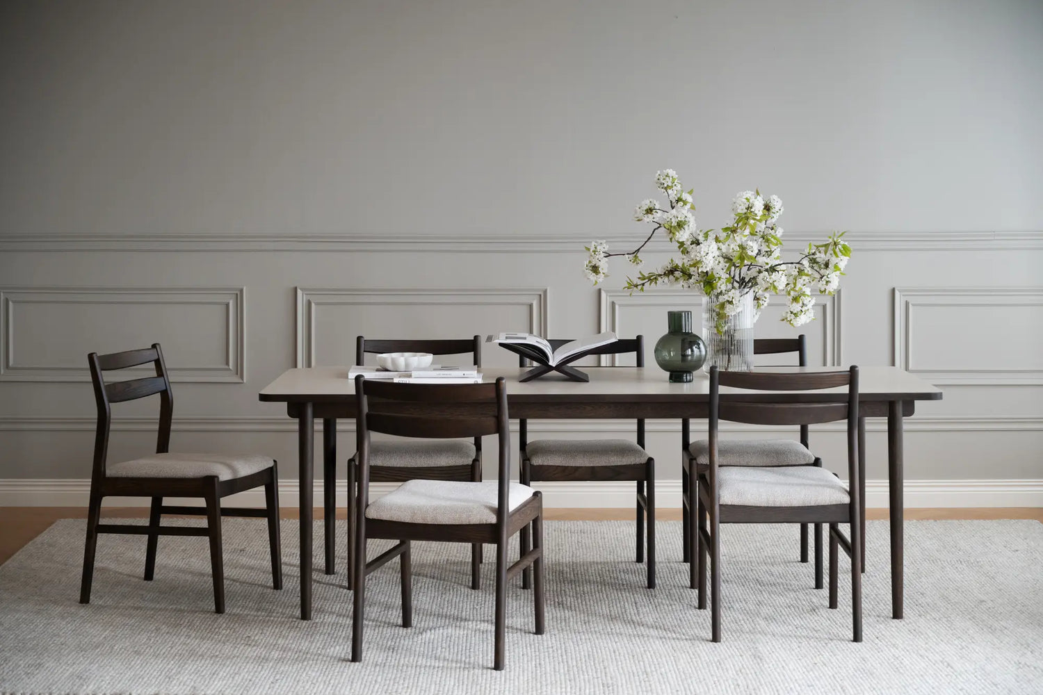 Fairmount spisebord er også svært fleksibelt og enkelt å tilpasse. Med én eller to ileggsplater på 45 × 95 cm kan bordet forlenges til 265 eller hele 310 cm, noe som gir god plass til både familie og gjester.
