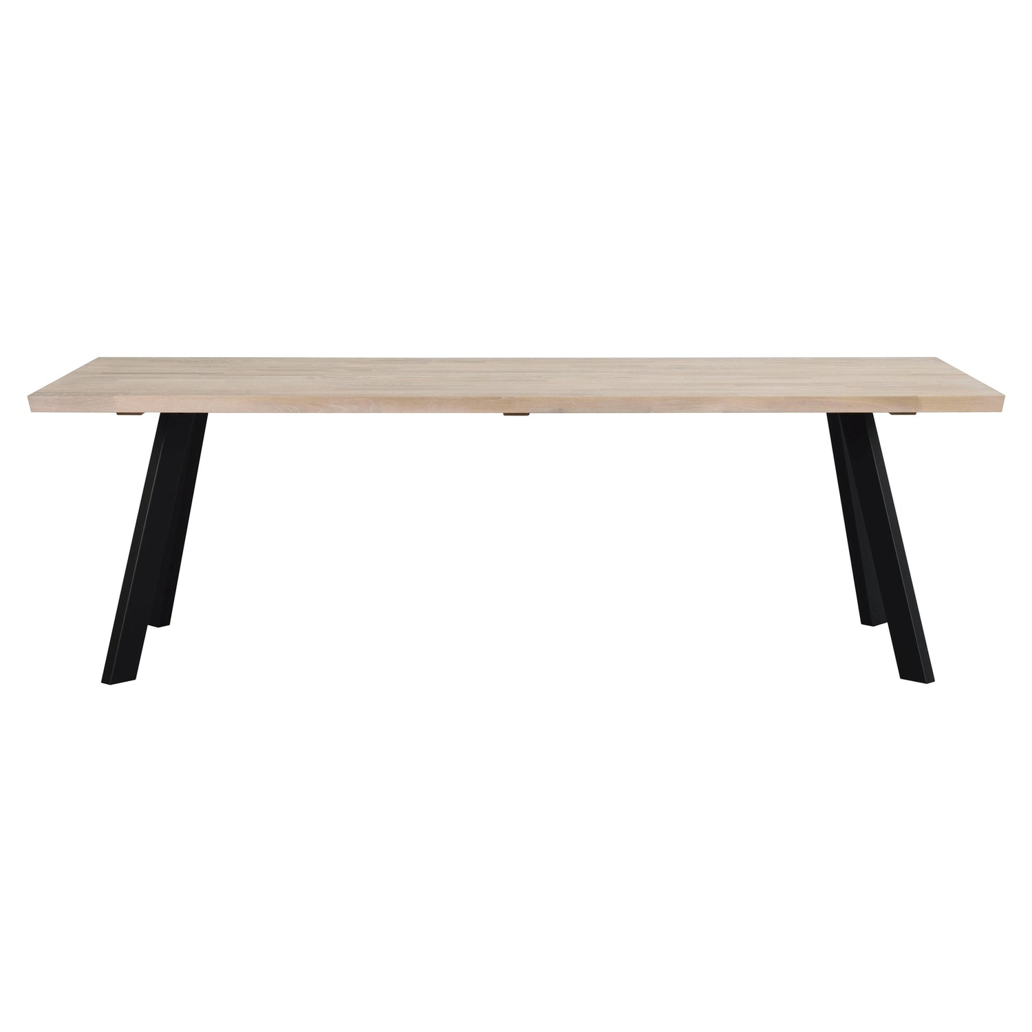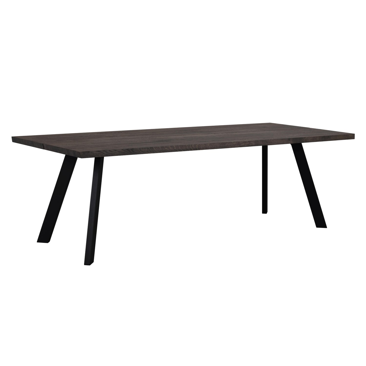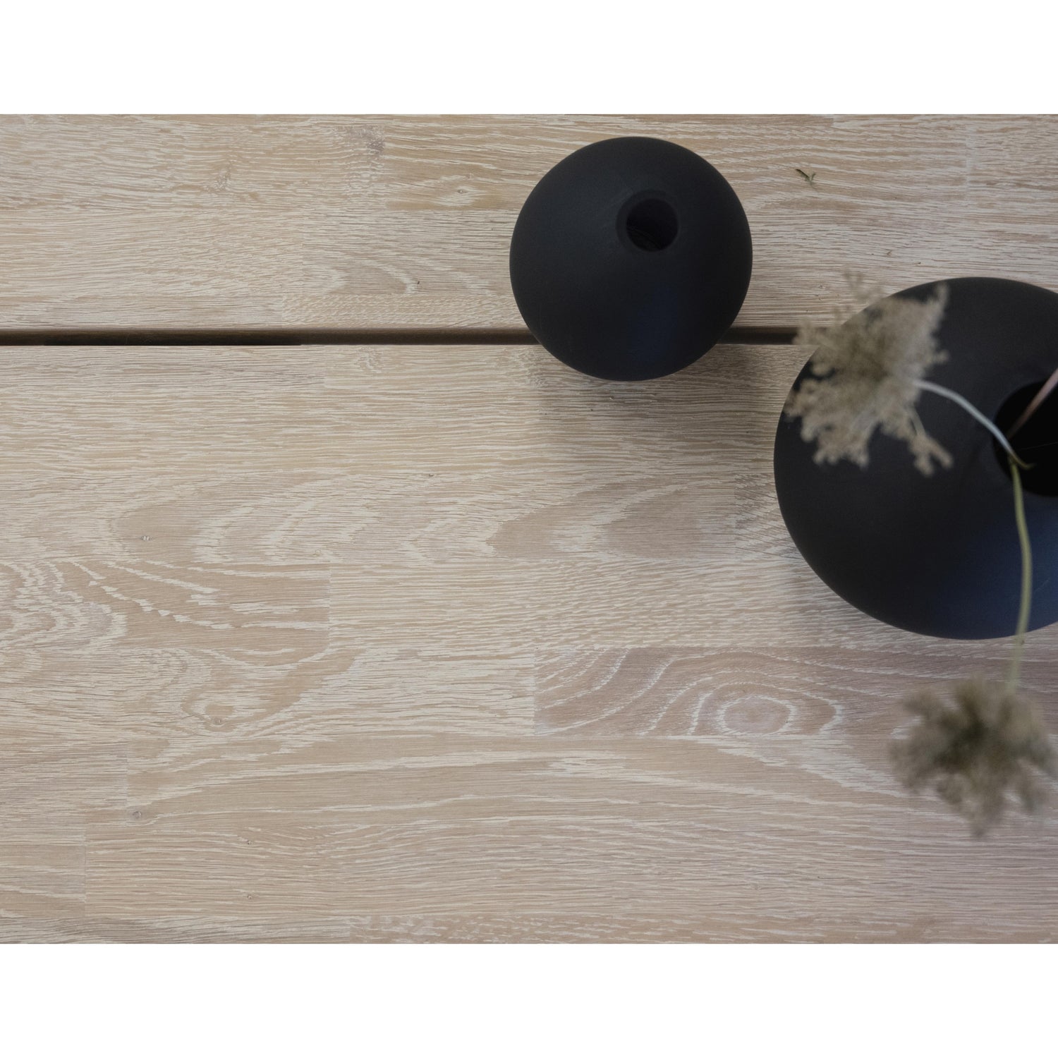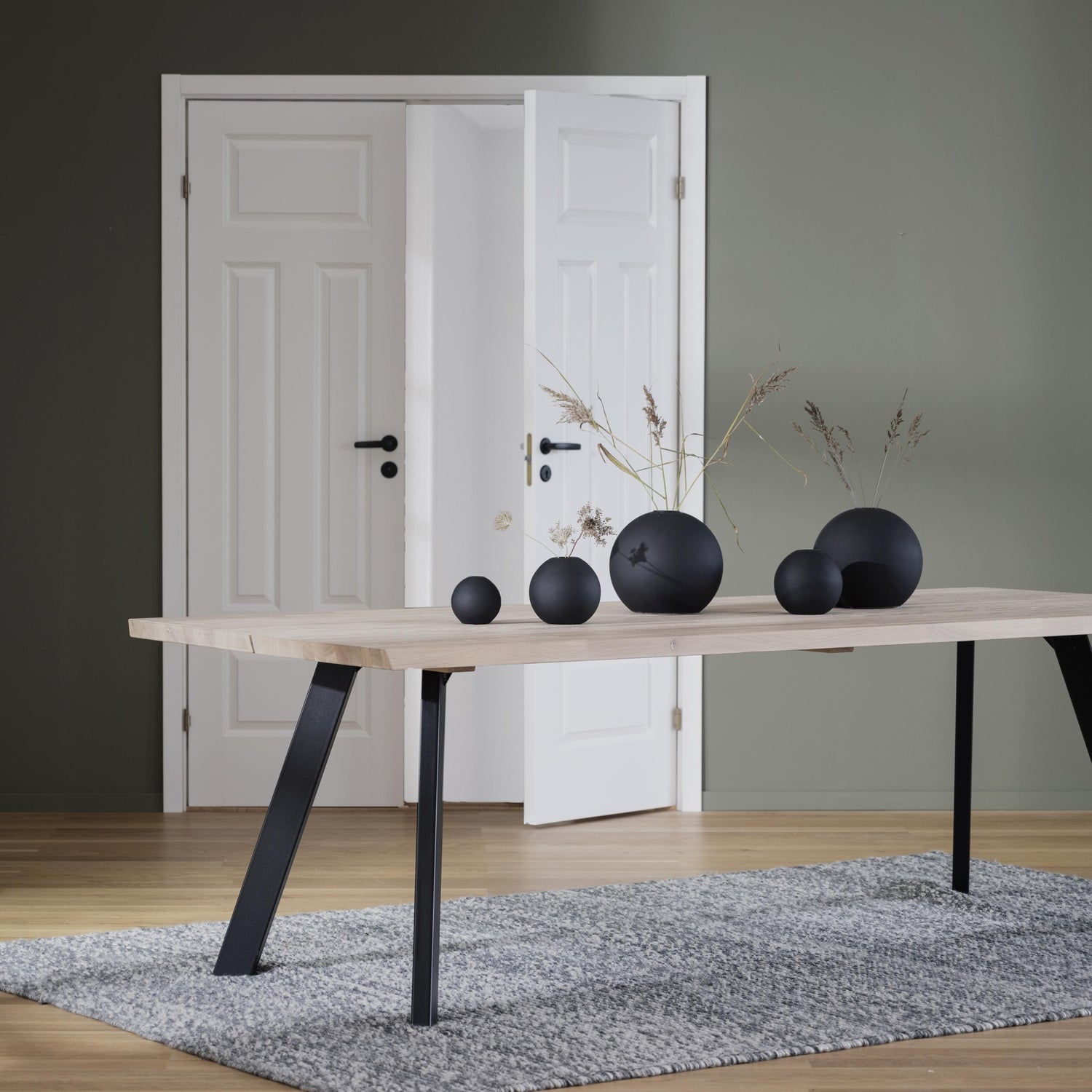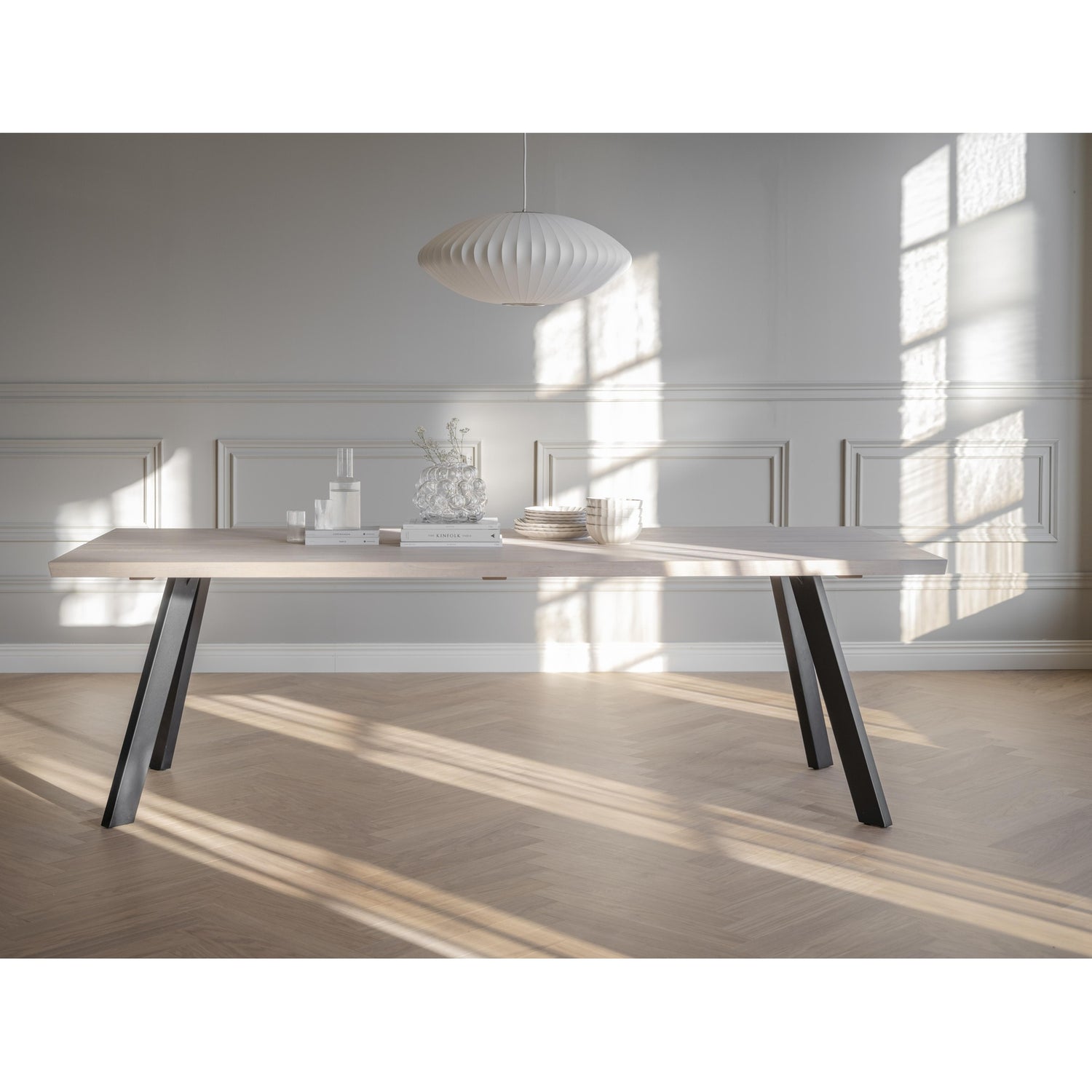 Moderne og eksklusiv spisebord med en to-delt bordplate i 100% FSC®-sertifisert massiv eik. Bordplaten har en børstet overflate og en stilren skråkant som gir et elegant preg. Benene kan justeres i tre forskjellige posisjoner og er laget av pulverlakkert svart metall, noe som gir en stabil og holdbar konstruksjon. Dette spisebordet er designet for å vare år etter år, og er et godt og bærekraftig valg for ditt hjem. Bordet er også tilgjengelig i en mindre størrelse og i rund form, noe som gjør det enkelt å finne den perfekte løsningen for ditt spiseområde. Velg et spisebord som kombinerer stil, funksjonalitet og miljøvennlighet.