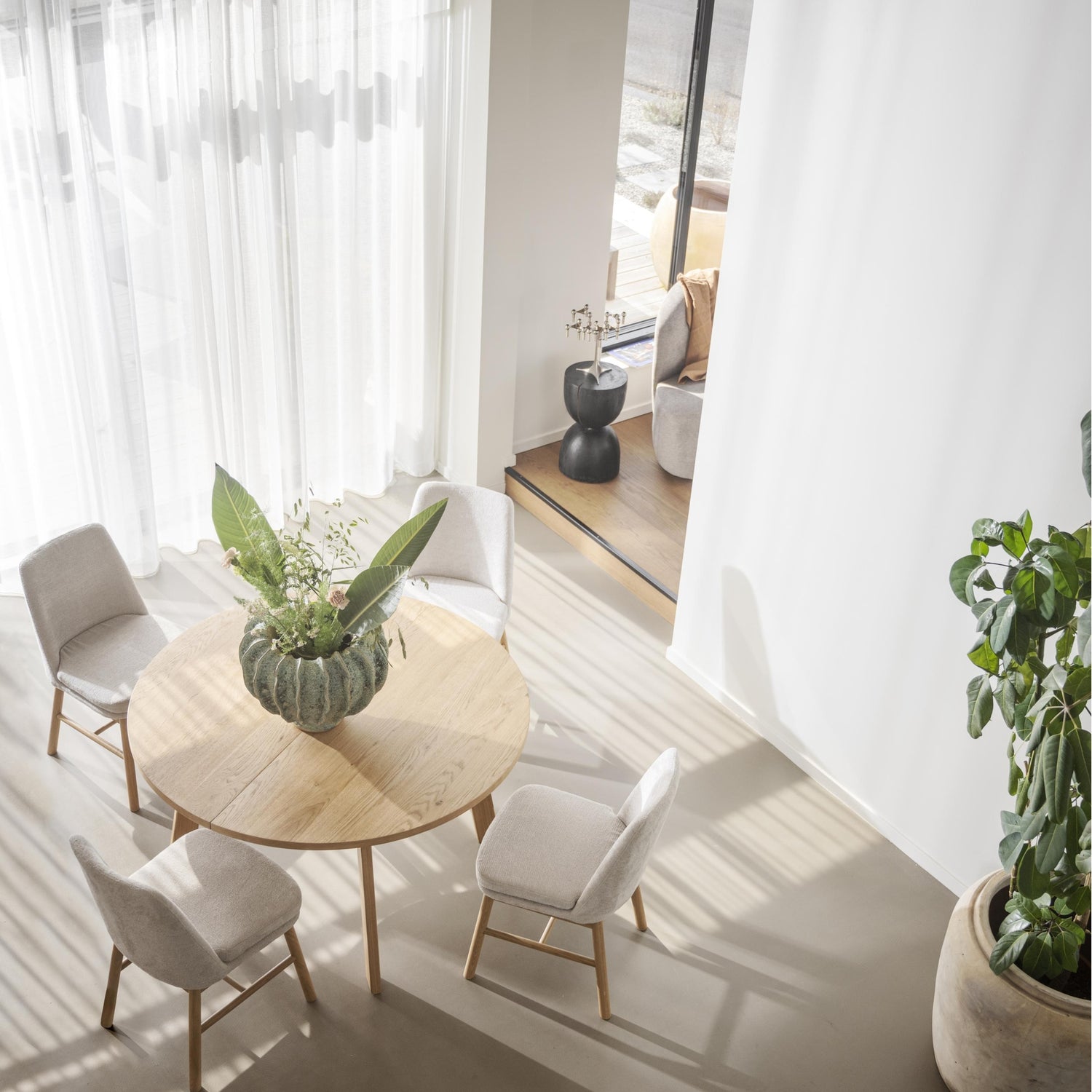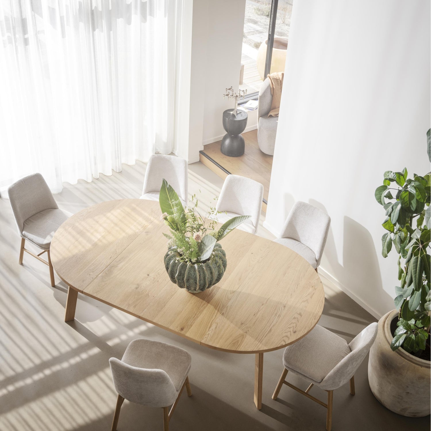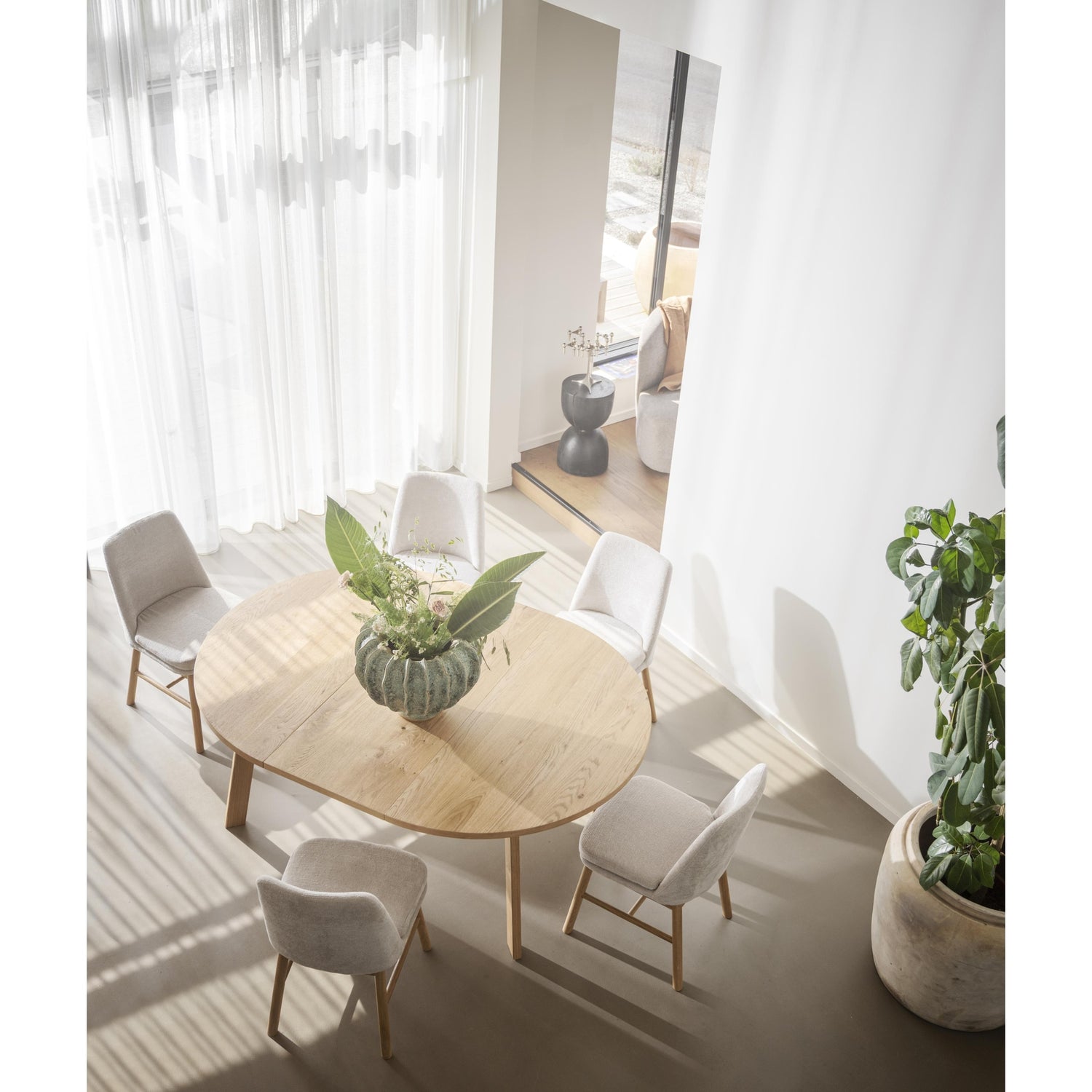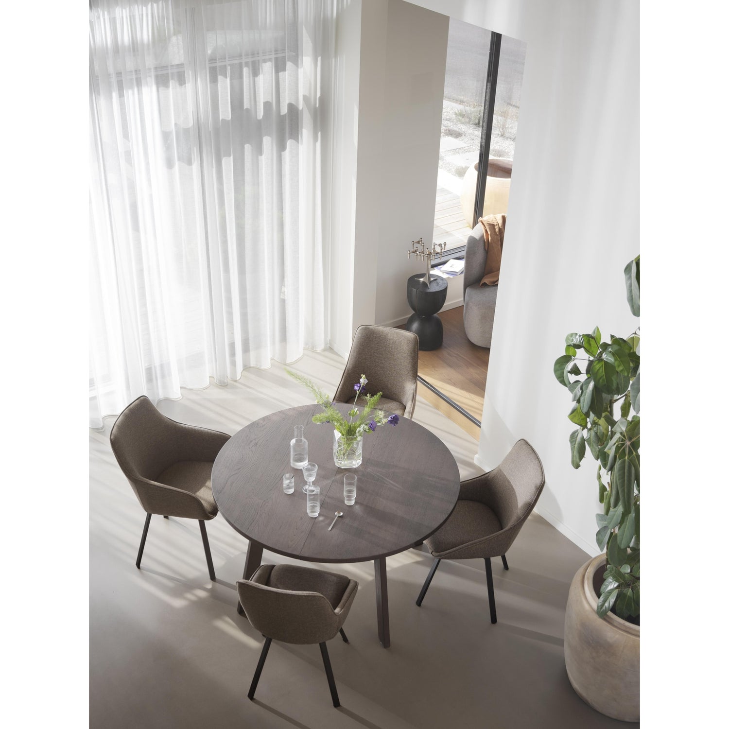 Glenside spisebord i FSC®-sertifisert eik med brunt olje har et minimalistisk skandinavisk design som kombinerer en rund bordplate med solide, rette ben i perfekt harmoni. Dette bordet er ideelt for både hverdagsbruk og festlige anledninger, og gir deg muligheten til å utvide plassen for gjester ved å legge til 1 eller 2 forlengelsesplater, som forvandler spisebordet til et stort ovalt bord.