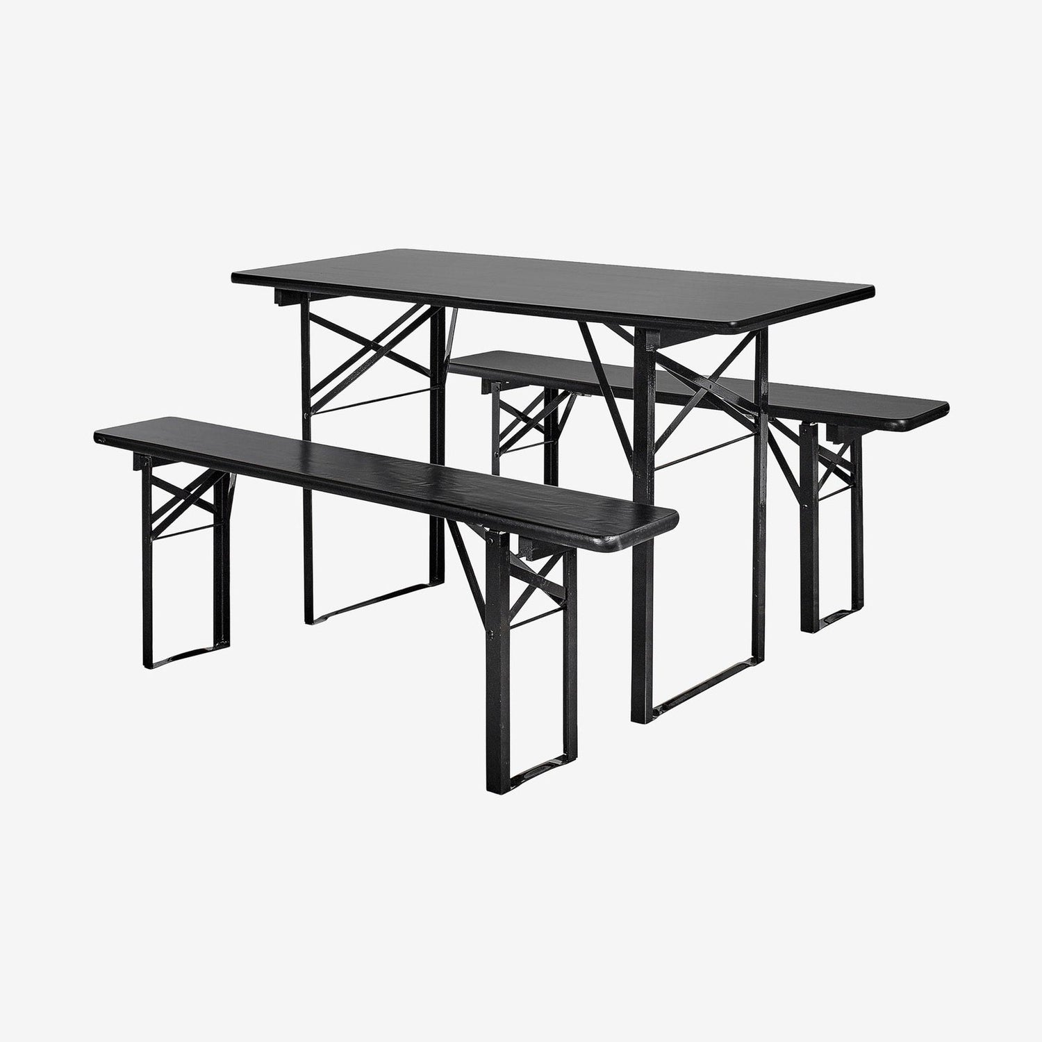 Flott bord- og benkesett laget av solid, svartlakkert furu og med ramme i svart metall. Sett består av bord og to benker, og kan også fint brukes innendørs. Bordet måler 160x60 cm, og har den fordelen at det passer godt inn på steder hvor det ikke er plass til et bredt spisebord. Se øvrige mål under produktinfo.
