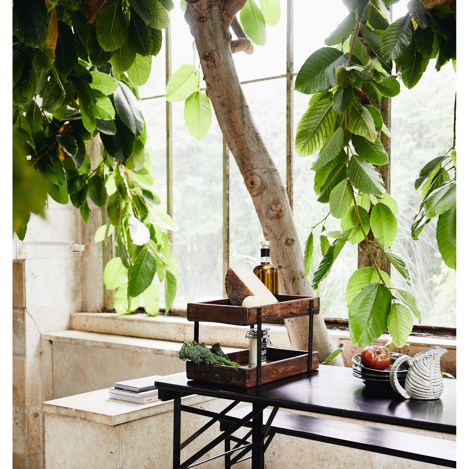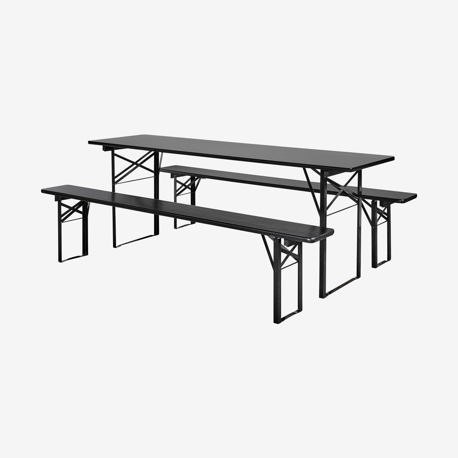 Flott bord- og benkesett laget av solid, svartlakkert furu og med ramme i svart metall. Sett består av bord og to benker, og kan også fint brukes innendørs. Bordet måler 220x60 cm, og har den fordelen at det passer godt inn på steder hvor det ikke er plass til et bredt spisebord. Se øvrige mål under produktinfo.