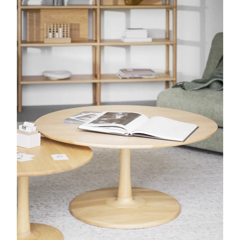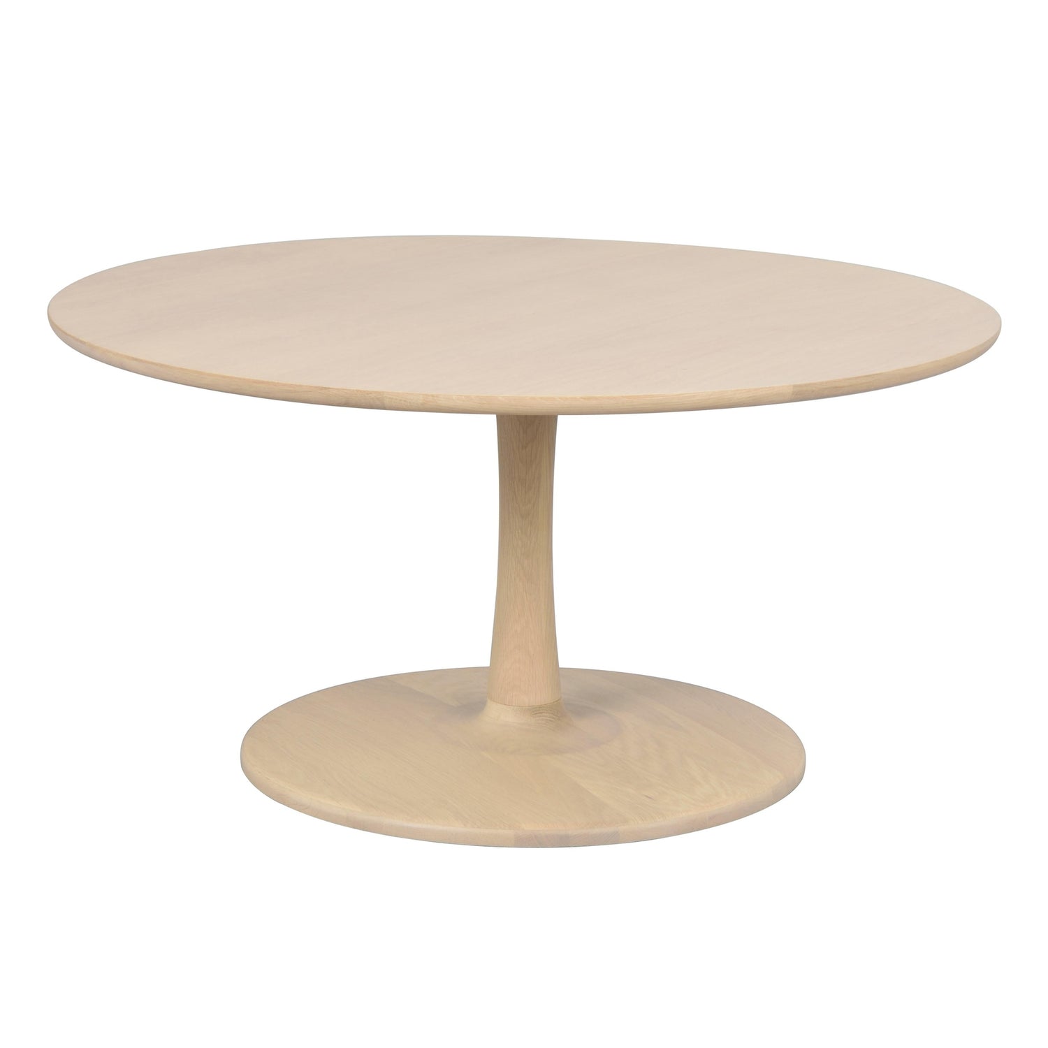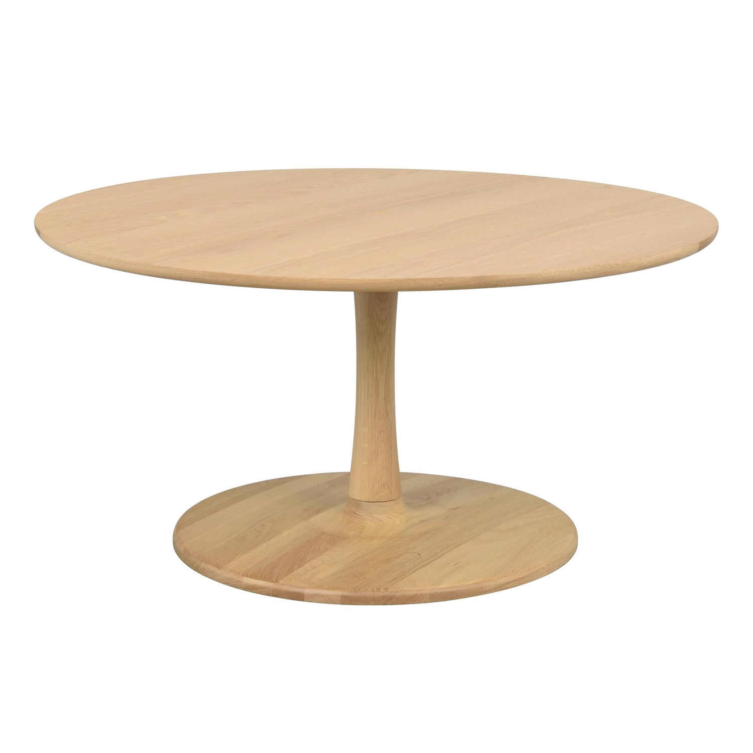 Hobart Kaffebord Ø90 i lakkert eik er et luftig og stilrent pedestalbord med skandinavisk design. Det tynne bordplaten med en vakker eikemønster møter det dreide benet i samme type treverk. Dette kaffebordet har organiske former som skaper myke, behagelige linjer.