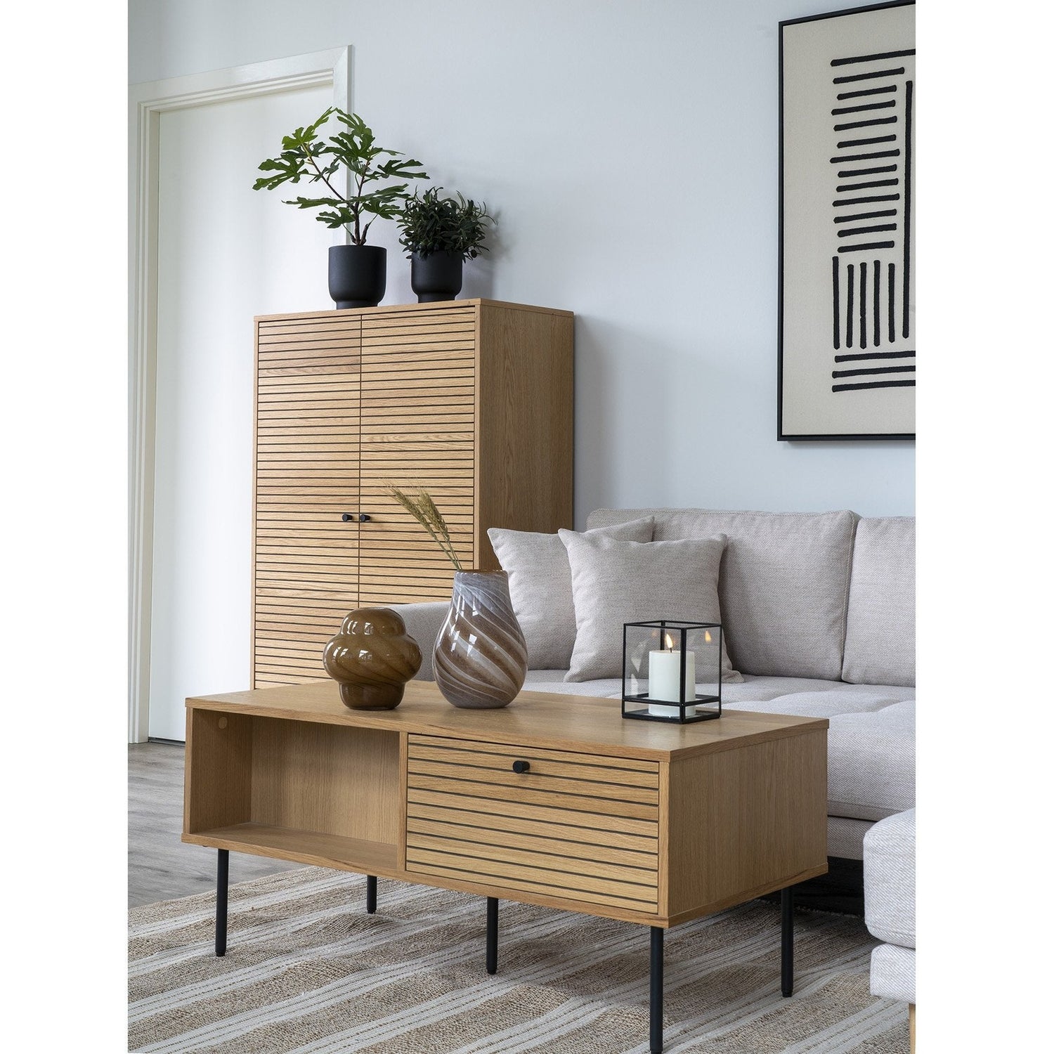 Kyoto kaffebordet kombinerer stil og funksjonalitet på en elegant måte. Med en vakker overflate i eikefiner og en moderne, røykfarget finish, tilfører dette bordet en varm og innbydende atmosfære til ethvert rom. De to praktiske skuffene gir rikelig med oppbevaringsplass for fjernkontroller, magasiner eller andre småting, slik at du kan holde stuen ryddig og organisert. Bordet hviler på solide ben i svart metall, som gir en kontrast til den naturlige treoverflaten og sikrer stabilitet og holdbarhet. Med dimensjoner på 50x100x45 cm passer Kyoto kaffebordet perfekt inn i både små og store rom, og er et ideelt valg for moderne hjem som ønsker en kombinasjon av estetikk og praktisk bruk.