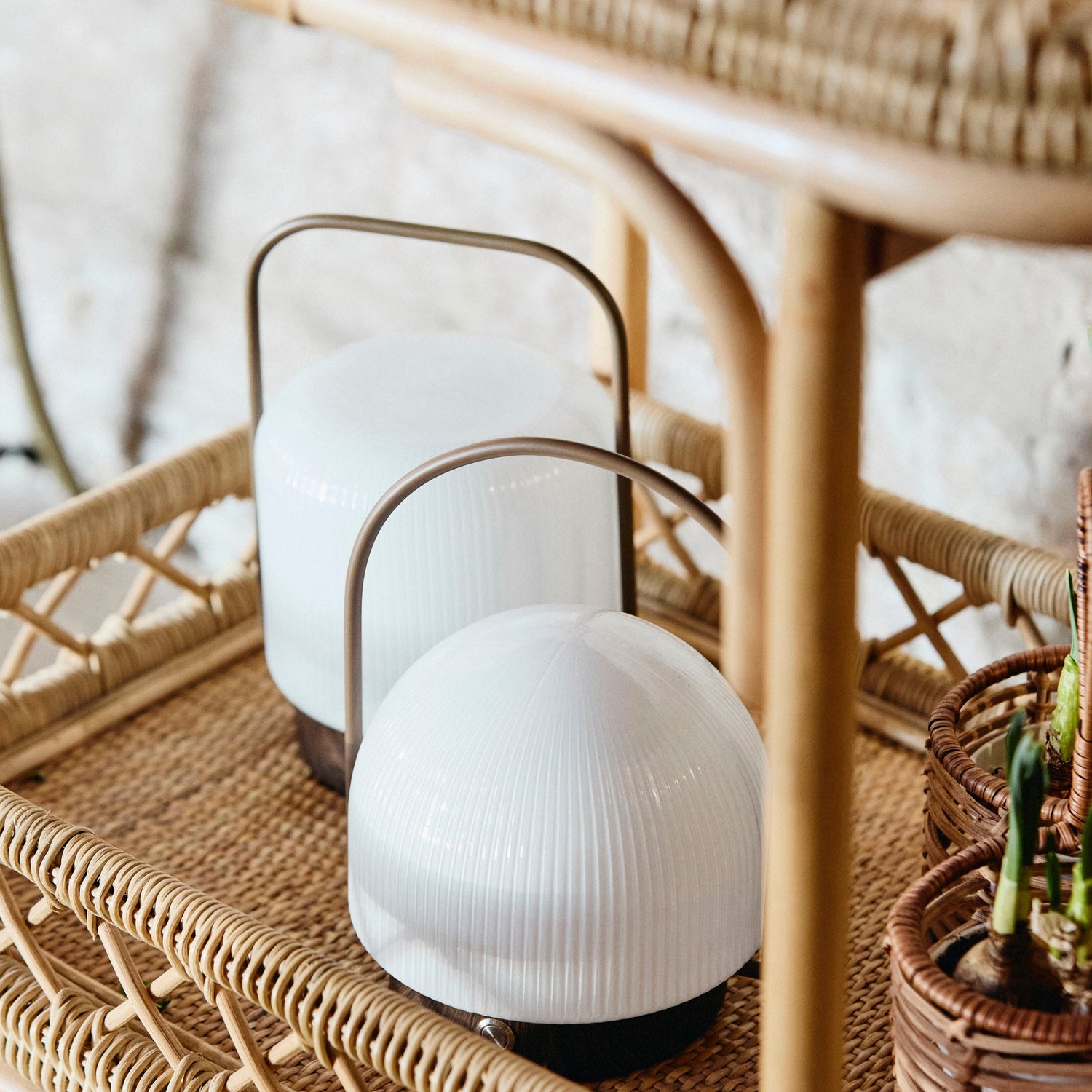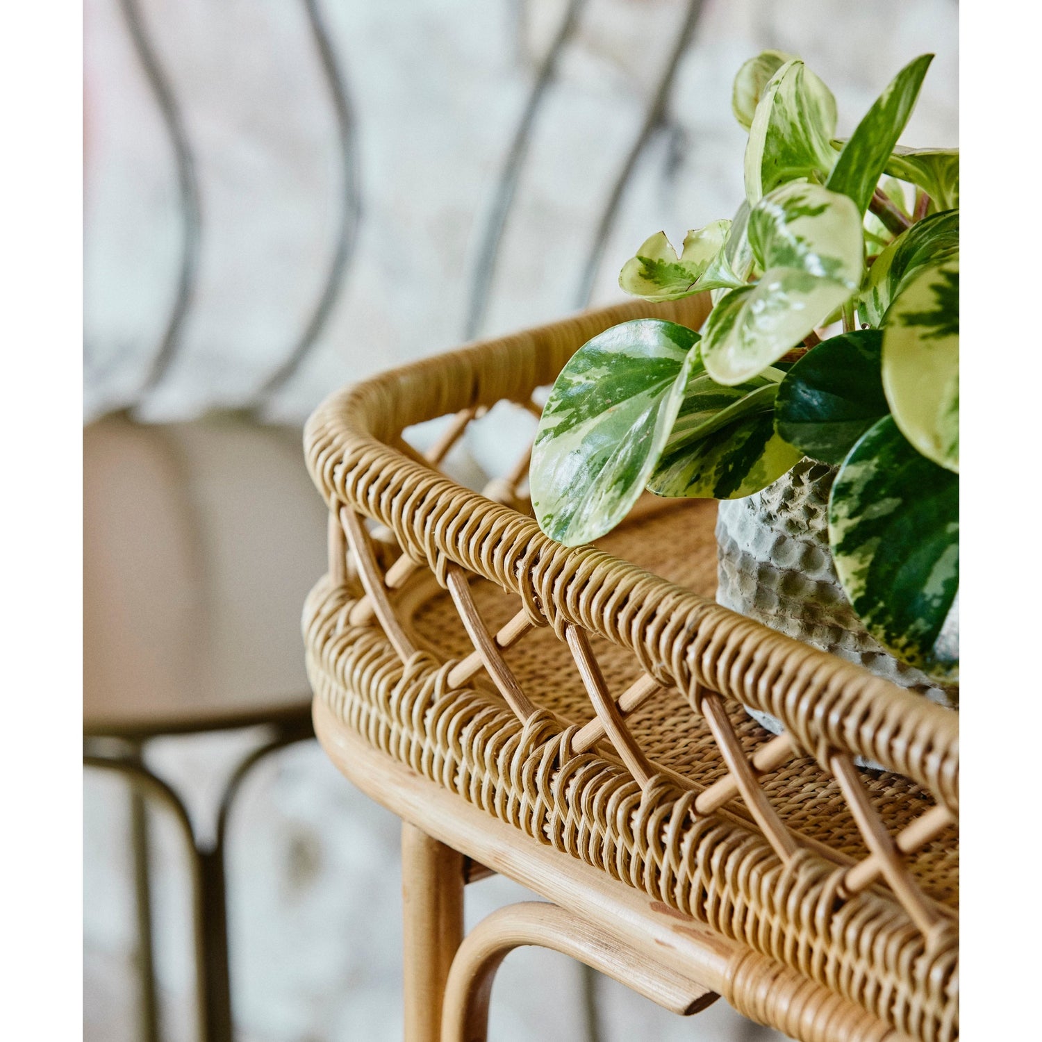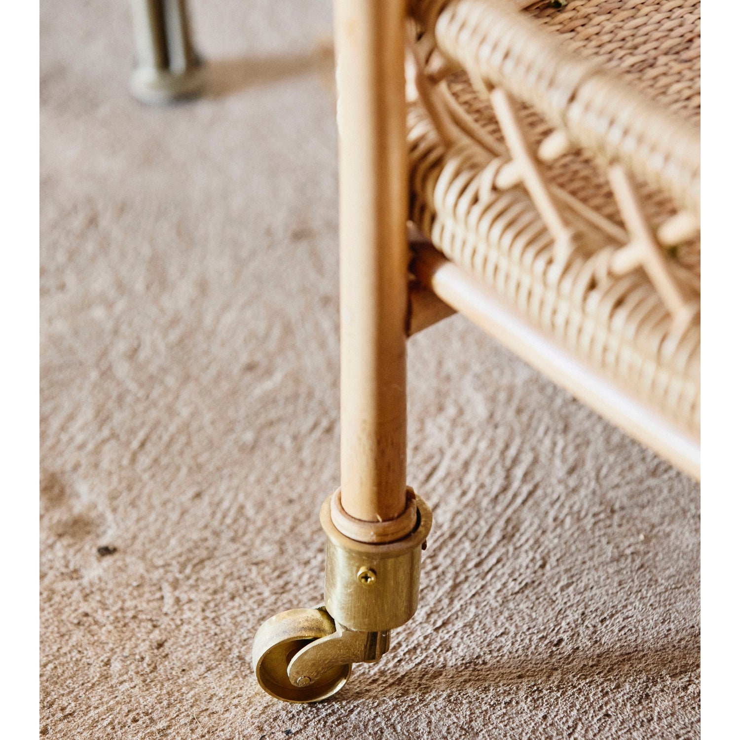 Praktisk rullebord laget av rattan og med messingfargede hjul. Rullebordet har to dekorative kurver i flettet rattan, og er perfekt til f.eks. oppbevaring i stuen og kjøkkenet eller som barbord.