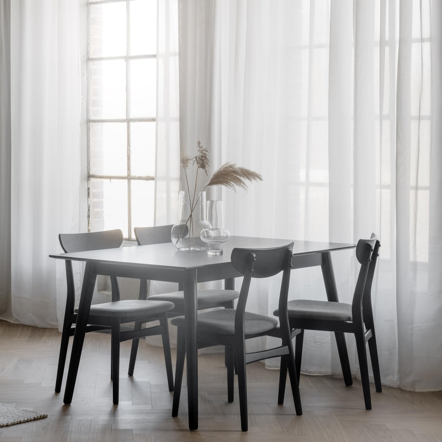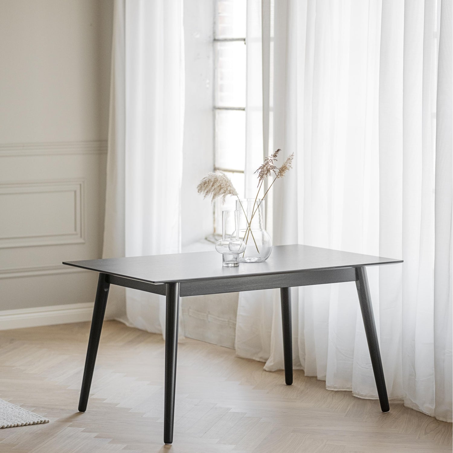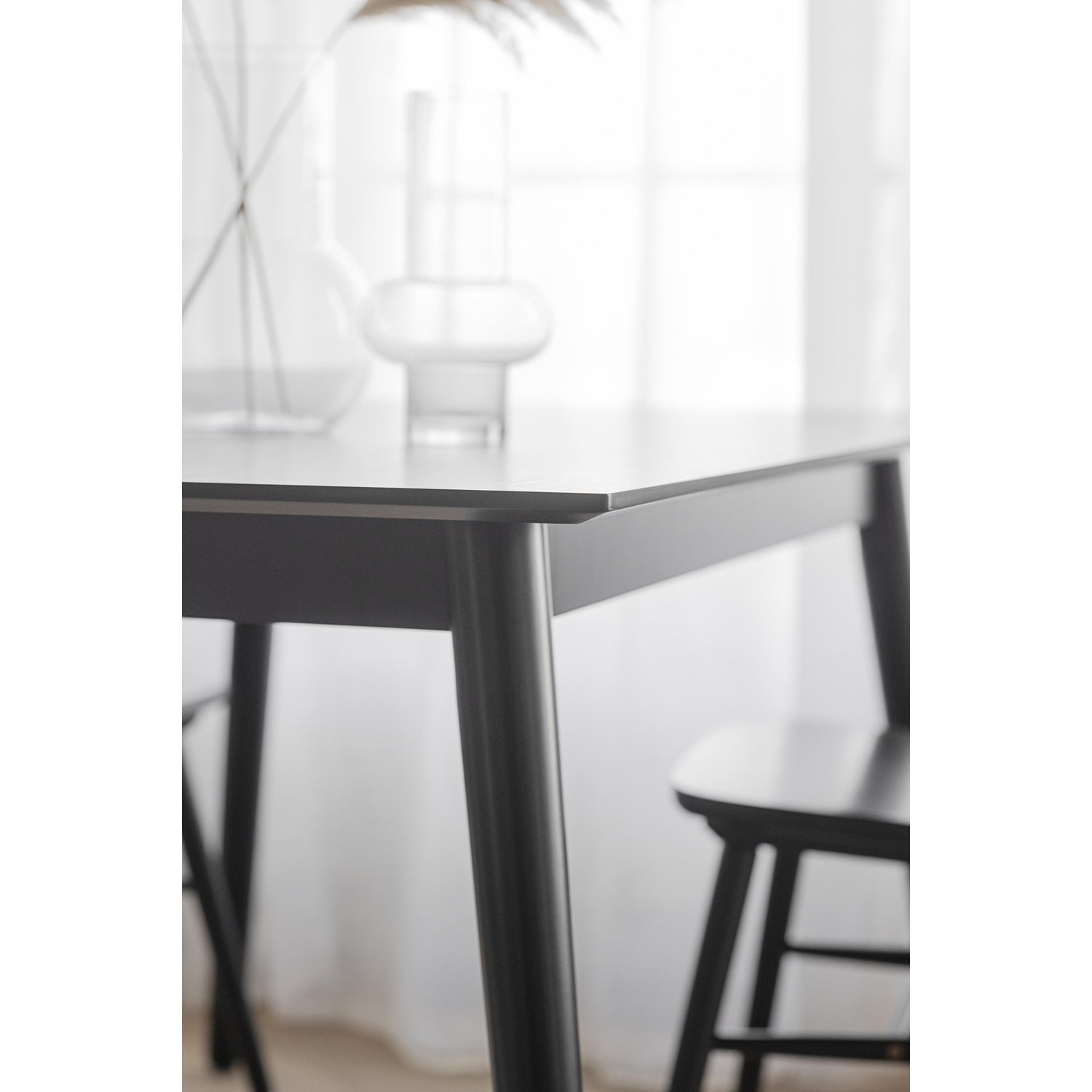 Bordplaten er laget av svartlakkert treverk, noe som gir en tidløs og sofistikert look. Den glatte overflaten gjør det enkelt å tørke av og holde bordet rent, noe som er perfekt for familier og travle husholdninger.