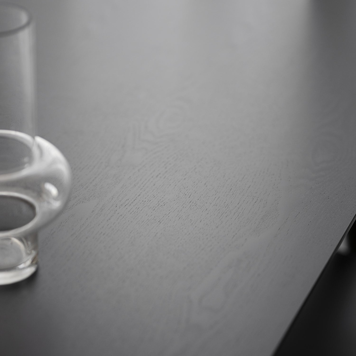 Materiale: Top i MDF med askefiner, lakkert. Ben og forkant i massiv gummitre (Hevea), lakkert.
