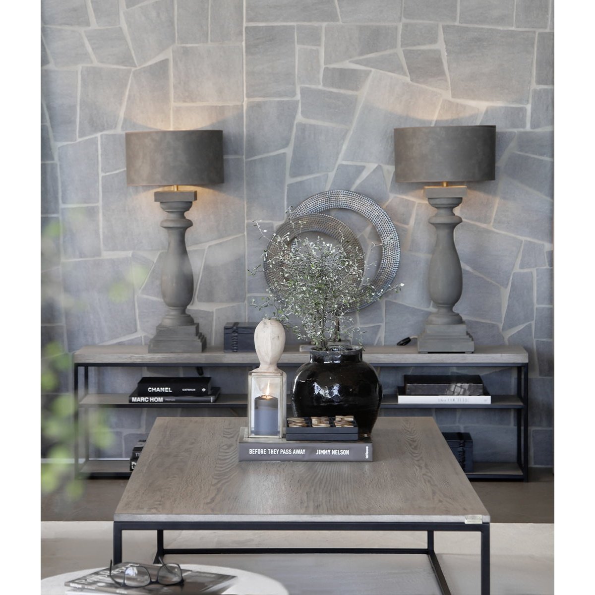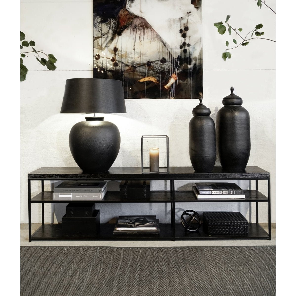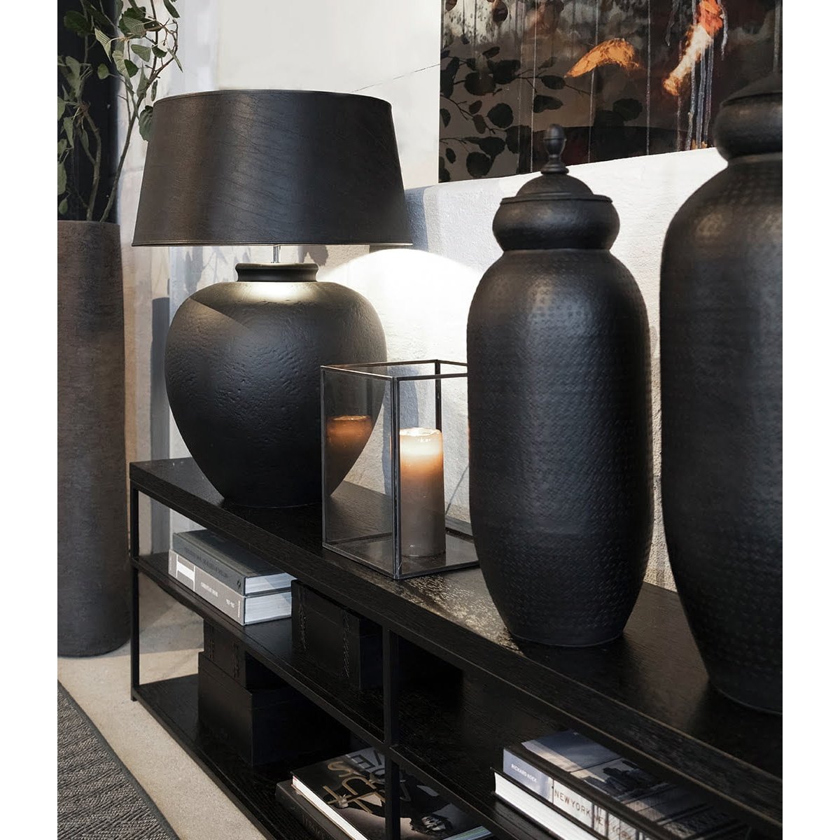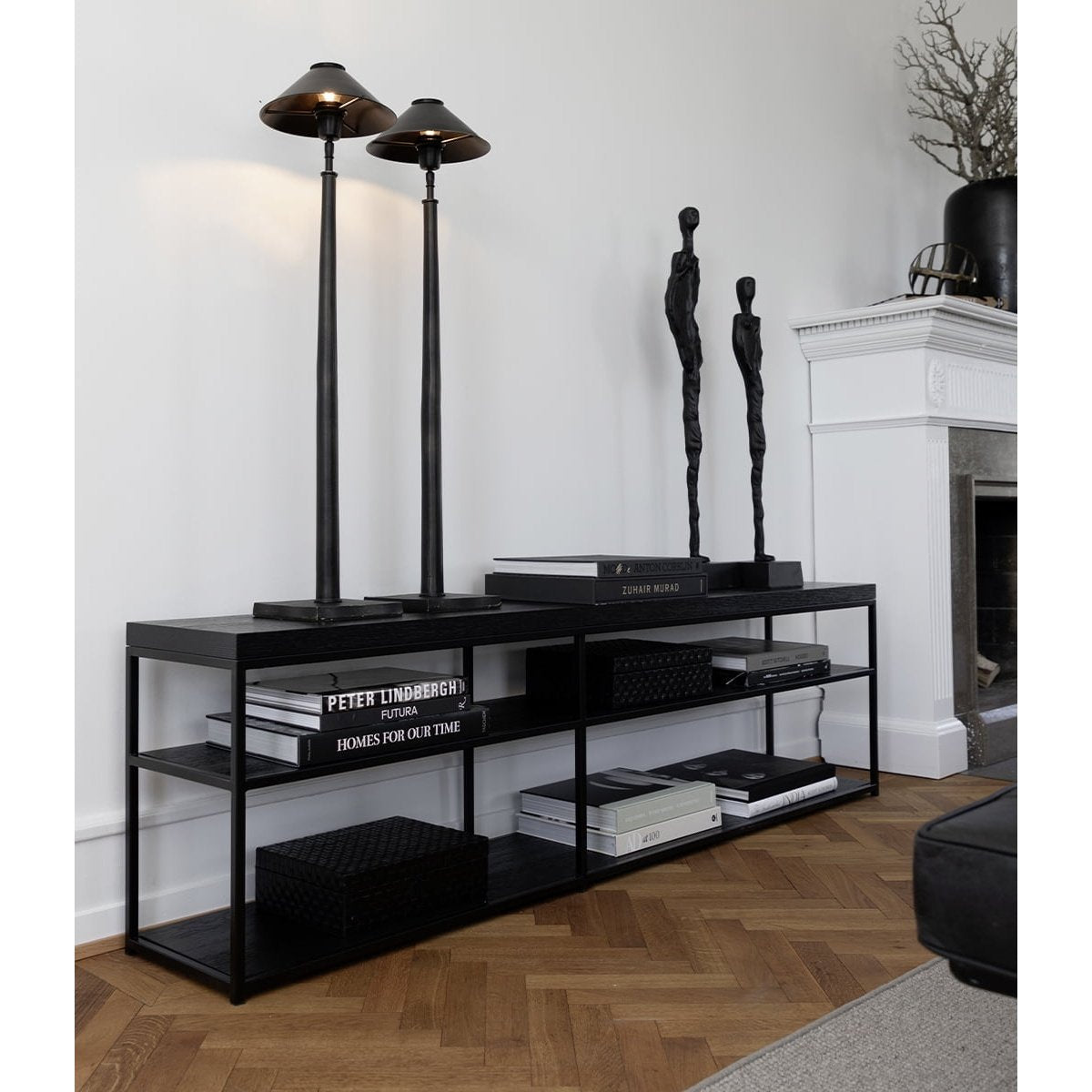 Mason konsollbord består av eikefinér i fargen svart. Mason-serien gir et moderne og lett inntrykk med sin tynne svarte metallbase, trestrukturen er tydelig på bordene og hyllene. Eikefinéren er malt og lakkert i flere stadier, noe som gir en hard og holdbar overflate, men beholder sitt naturlige utseende.
