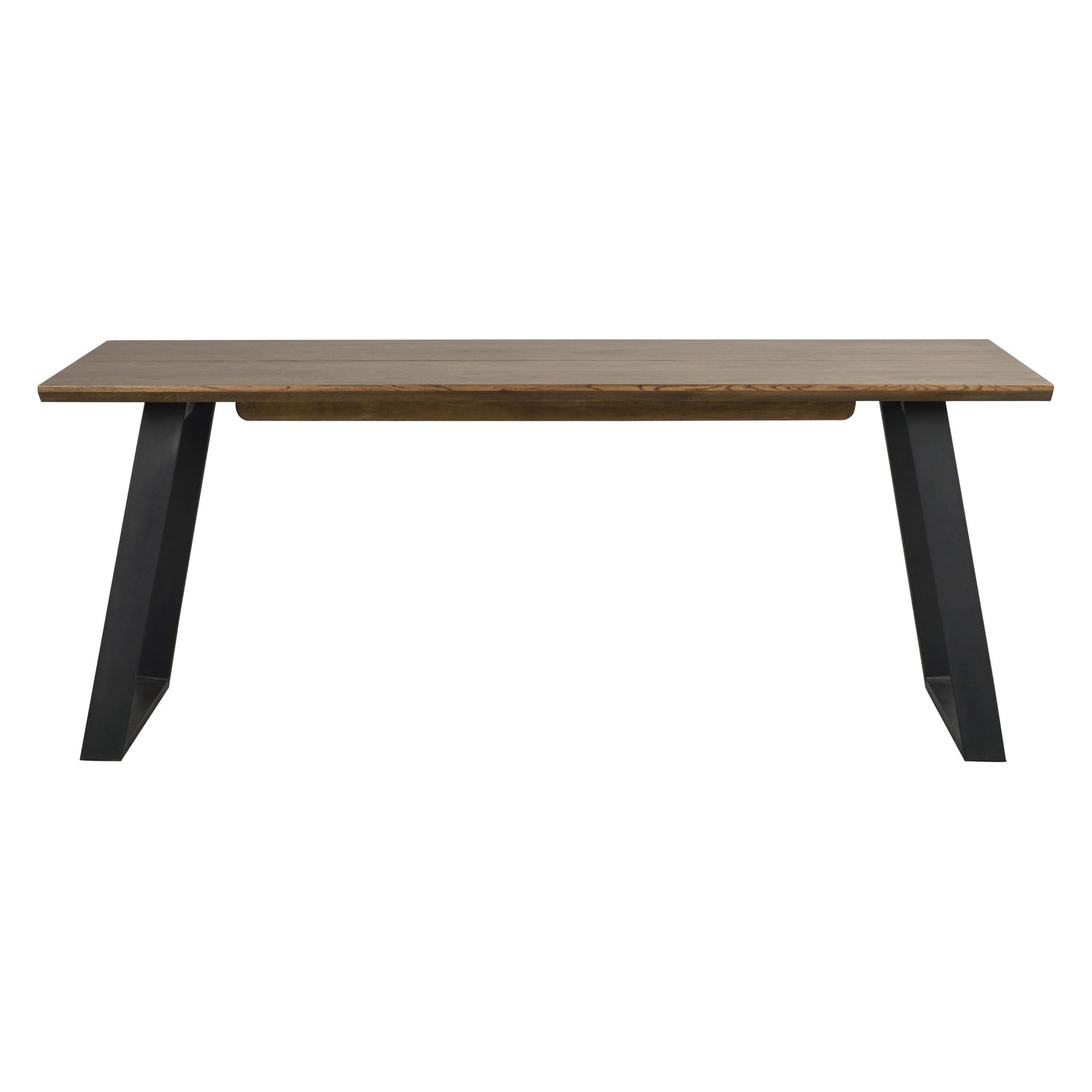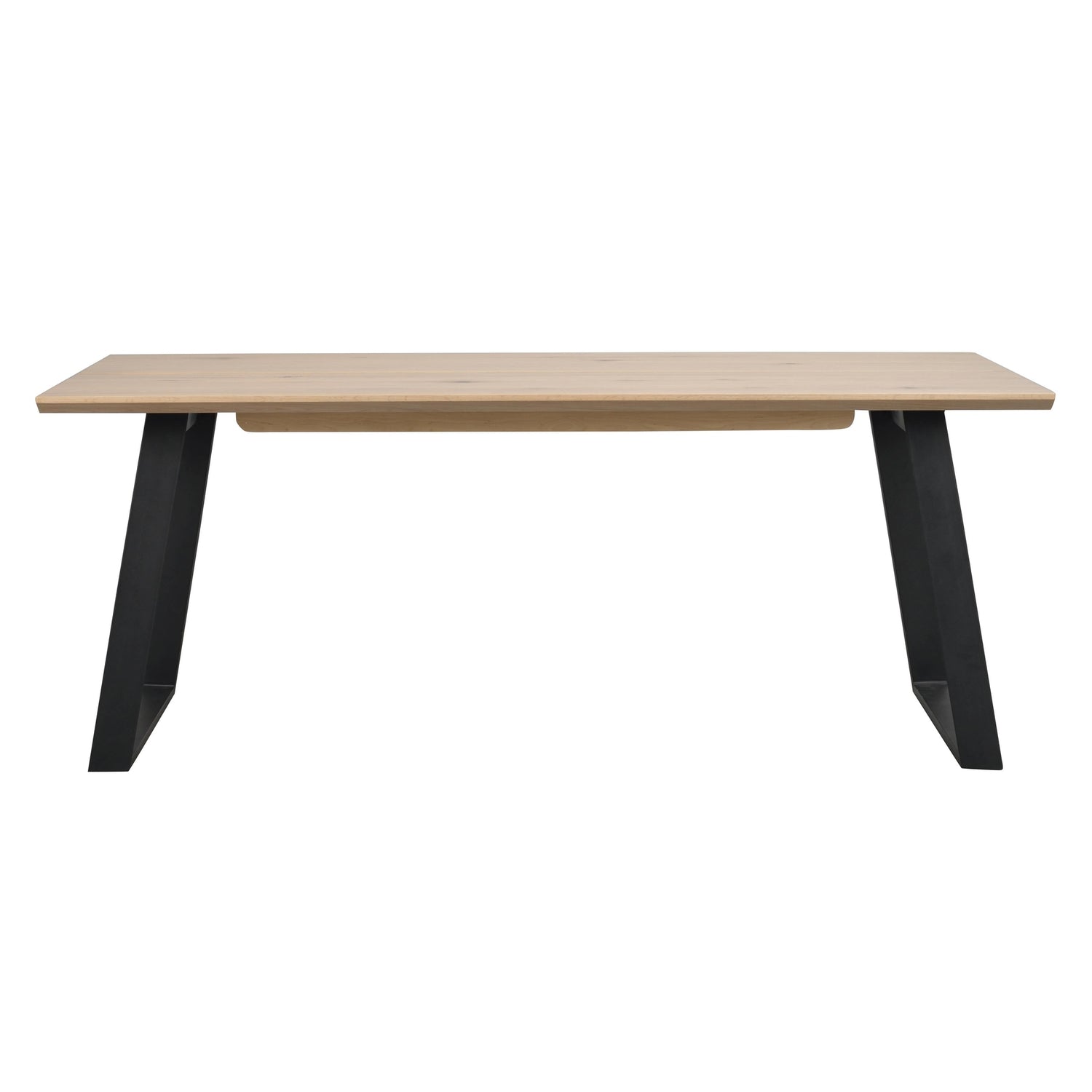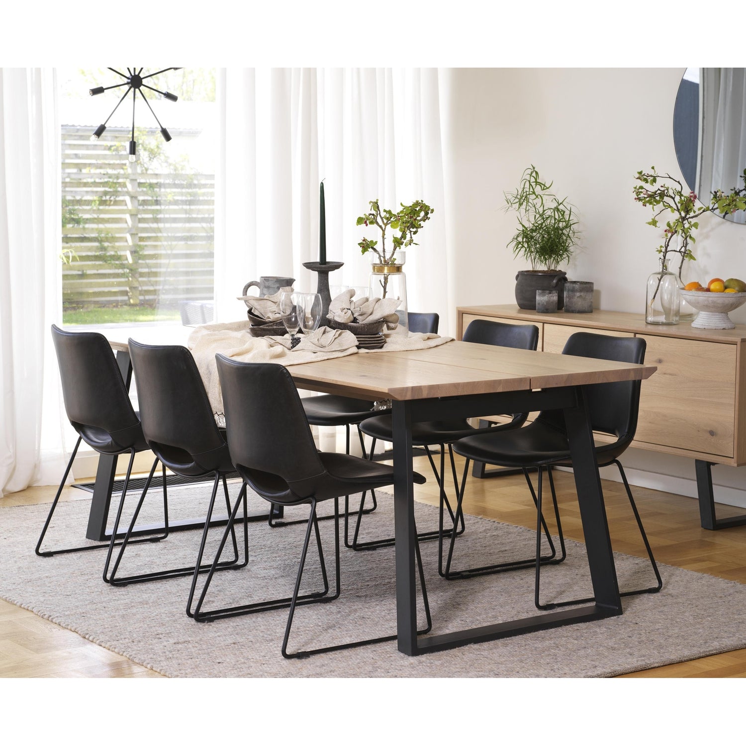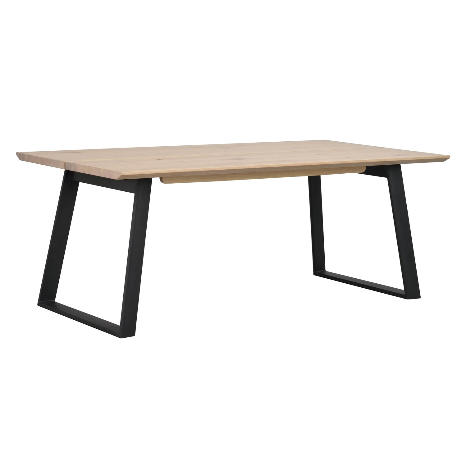 Oppdag det moderne Melville spisebordet, designet for å gi både stil og funksjonalitet til ditt hjem. Dette spisebordet har en to-delt bordplate i hvitvasket eik, kombinert med en stabil metallbase i svart.