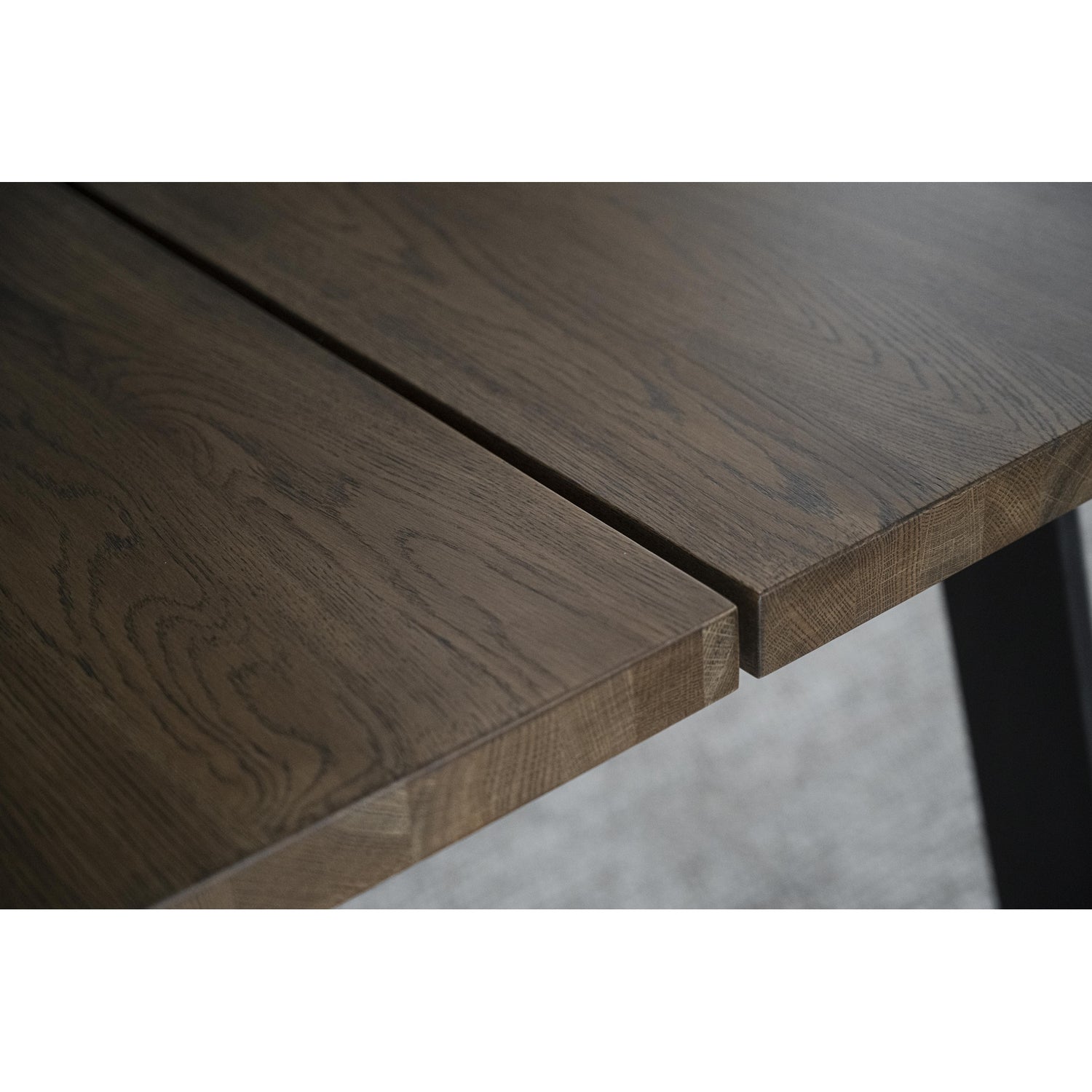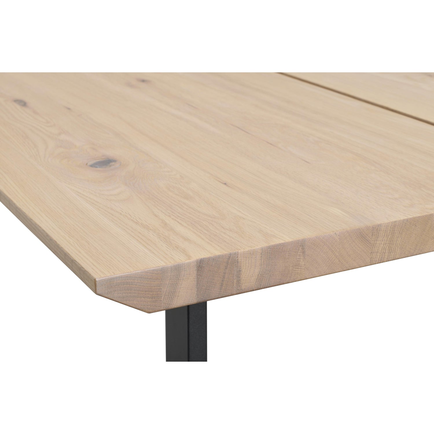 Bordplaten er laget av vill eikefiner, noe som gir hvert bord et unikt preg med synlige knuter og merker. Dette gjør at hvert møbel blir personlig og skiller seg ut i ditt hjem. De solide kantene i eik gir ekstra holdbarhet og gir bordet et massivt og robust inntrykk.